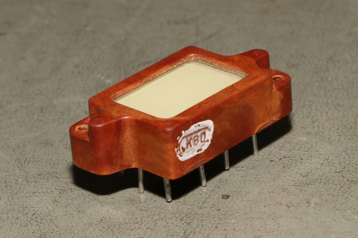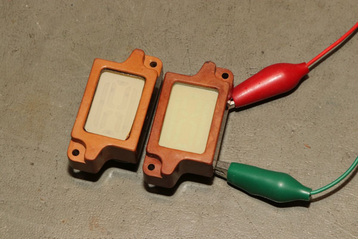 {IEL-0-IV EL-Display} Sowjetische Displaytechnik des letzten Jahrtausends ist stets für Überraschungen gut. Wer sonst kam auf die Idee, Elektrolumineszenzfolien als Displayelemente zu verwenden? Der Vorteil: jede beliebige Segmentform ist ohne großen Aufwand möglich. Der Nachteil: die Dinger sind dunkel, brauchen 150V Wechselspannung und die Haltbarkeit ist grenzwertig. Es gibt Gründe, warum sich das nicht durchgesetzt hat. Hier sehen wir Displays des Typs ИЭЛ-0-IV
