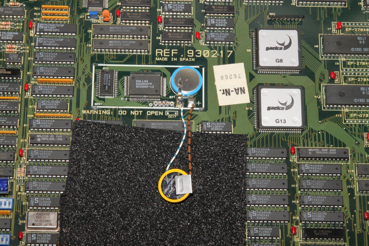 {World Rally Batterietausch} Eigentlich wollte ich das Teil wegpacken - dann überfiel mich hemmungsloses Verantwortungsbewusstsein: was, wenn die Backup-Batterie schlapp macht... wäre doch schade. Also sofort den Deckel abgesprengt, den man nie nicht öffnen soll... Darunter: ein Dallas Microcontroller, ein SRAM mit Decryption-Tabelle und eine Lithium-Zelle. Das Datenblatt des SRAM zeigt, dass dieses speziell für Batteriebetrieb ausgelegt ist. Mein Multimeter sagt mir, dass die Zellenspannung auf 3,1V abgesunken ist - eine frische Lithiumzelle hat 3,3V... Es wird Zeit!!! Das SRAM darf nicht stromlos werden, ein Puffer-Elko wie bei CPS2 fehlt hier. Dafür wird das SRAM bei angeschlossener PCB mit 5V versorgt - Sicherheitshalber sorge ich für eine Notstromversorgung, man weiss ja nie... Gute Vorbereitung und eine ruhige Hand beim Löten ist hier wichtig. Man muss vor Allem beim Auslöten der Originalbatterie darauf achten, dass die Überbrückungsbatterie nicht mit ausgelötet wird! Notstrom angeschlossen: Schlappe Zelle entfernt: Neue Zelle dran: Notstromversorgung abgeklemmt: Ein Tropfen Heißkleber fixiert das Ganze: Eigentlich kann ja wenig schief gehen, wenn man die PCB angeschlossen hat, das SRAM bekommt ja immer Saft, aber spannend ist es doch. Aber wenn der CoPro O.K. ist, dann ist alles gut, auch wenn das Foto zufällig einen Grafik-Glitch eingefangen hat... Und den Deckel als Berührschutz habe ich auch gleich noch mit Heißkleber fixiert, nicht, dass noch was kaputt geht. Es passt nicht mehr alles drunter, dafür lebt das Spiel wieder Jahre länger! |
