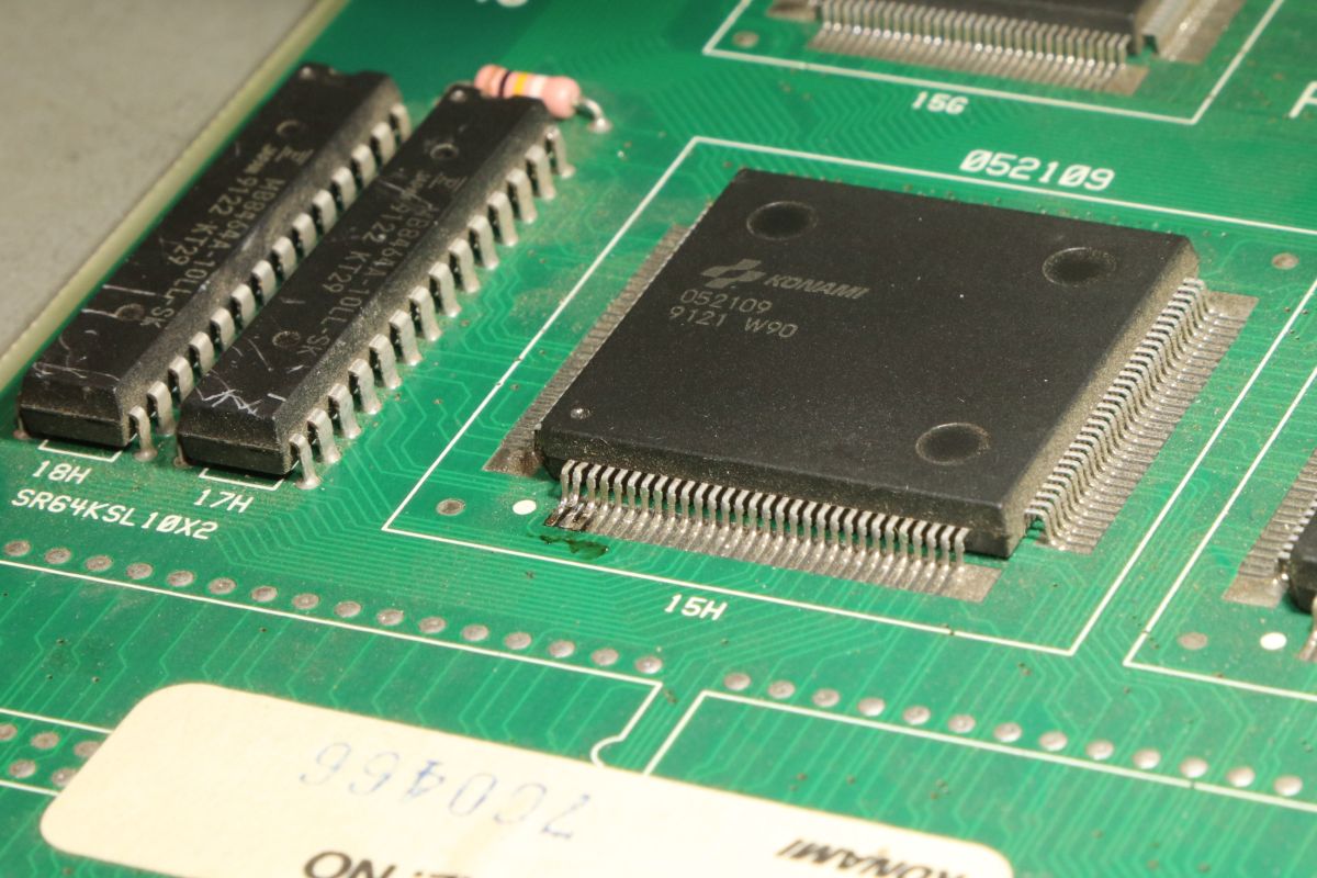 {Thunder Cross II} Ich mag es, wenn Spiele eindeutige Fehlermeldungen geben... hier mal eine Konami Thunder Cross II Platine: OK, so ganz eindeutig ist das jetzt nicht... die Platine stottert... Um genau herauszufinden, was mir die Testroutine sagen möchte, suche ich mal einen Reparaturbericht aus dem Internet... So sieht das aus, wenn die Platine noch keinen Logopäden braucht: Folglich sind also RAM 17H und 18H suspekt. Da kann man schon mal gezielt suchen und siehe da - Adressbit A0 ist stuck high. Das erklärt die Doppelung der Textzeichen. Die beiden RAMs hängen ausschließlich am Konami Custom 052109. Ein Durchzwicken des Adresspins am RAM zeigt, dass die RAMs selber nicht die Fehlerquelle sind. Ich befürchte einen Defekt im Custom - die Adressleitung hat immerhin nur noch 2,7 Ohm gegen +5V. Ich lifte mal das Beinchen 2... Yepp... der Custom ist hin. Den gibt es leider nicht mehr im Konami-Fachhandel. Aber ich habe zeitgleich eine Parodius mit zur Reparatur bekommen, die völlig defekt ist... vielleicht haben wir ja Glück. Der Custom hier muss raus - dafür ist der Heißluftfön gut... ...entfernt... ...geputzt... Die Parodius wird einer sinnvollen Zweitverwertung zugeführt: Dann wird der Custom unter dem Stereomikroskop sauber ausgerichtet und Pin für Pin vorsichtig wieder verlötet. Das dauert seine Zeit... ...lohnt sich aber... Ein gutes Ballerspiel lebt wieder! Gerade bei Spielen mit Unmengen an Custom Chips ist es gut, diverse Leichen zum Schlachten griffbereit zu haben! |