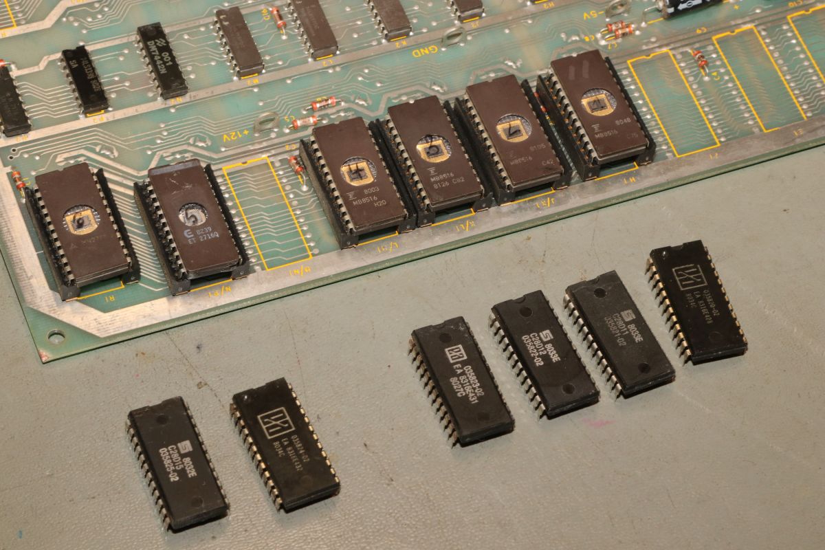 {Missile Command} Ein interessanter Fehler: der Programmablauf stimmt im Wesentlichen, aber die Grafik ist an vielen Stellen völlig versaut. Nicht alle Bildschirmbereiche sind betroffen, der Programmablauf nutzt ja auch das RAM, also vermute ich Teildefekte. Der Adressbus sieht sauber aus. Manchmal versagt sogar VSYNC... Nächster Stop: alle 4116 RAMs tauschen. {Missile Command Update} Super - das Entsockeln der RAMs ist eine langwierige Geschichte... Letztendlich waren tatsächlich alle RAMs einwandfrei. Immerhin sind sie jetzt mal alle gesockelt und getestet. Manche Impulse sind nur 250ns lang - aber das ist O.K., meine Referenz hat das bestätigt. Ebenso, wie der manchmal etwas verzögerte Systemtakt. Das muss so. Die PROMs gegen nachweislich korrekte EPROMs getauscht: keine Änderung. Nebenbei: Pokey und Control-PROM sind auch einwandfrei... Langsam steigt Verzweiflung auf. Es sind keine fehlerhaften Signale mit dem Oszi zu finden. Der Programmablauf ist korrekt, nur die Grafik ist versaut und wenn es dann ganz wirr läuft, versagt auch das Sync-Signal. Ich tausche die ersten Bustreiber auf Verdacht. Und die nächsten... Und noch ein paar Decoder... Und noch einen... Leider ändert das am Verhalten der Platine genau garnichts. Vielleicht hilft mir ja jetzt meine frisch reparierte eigene MC weiter... |