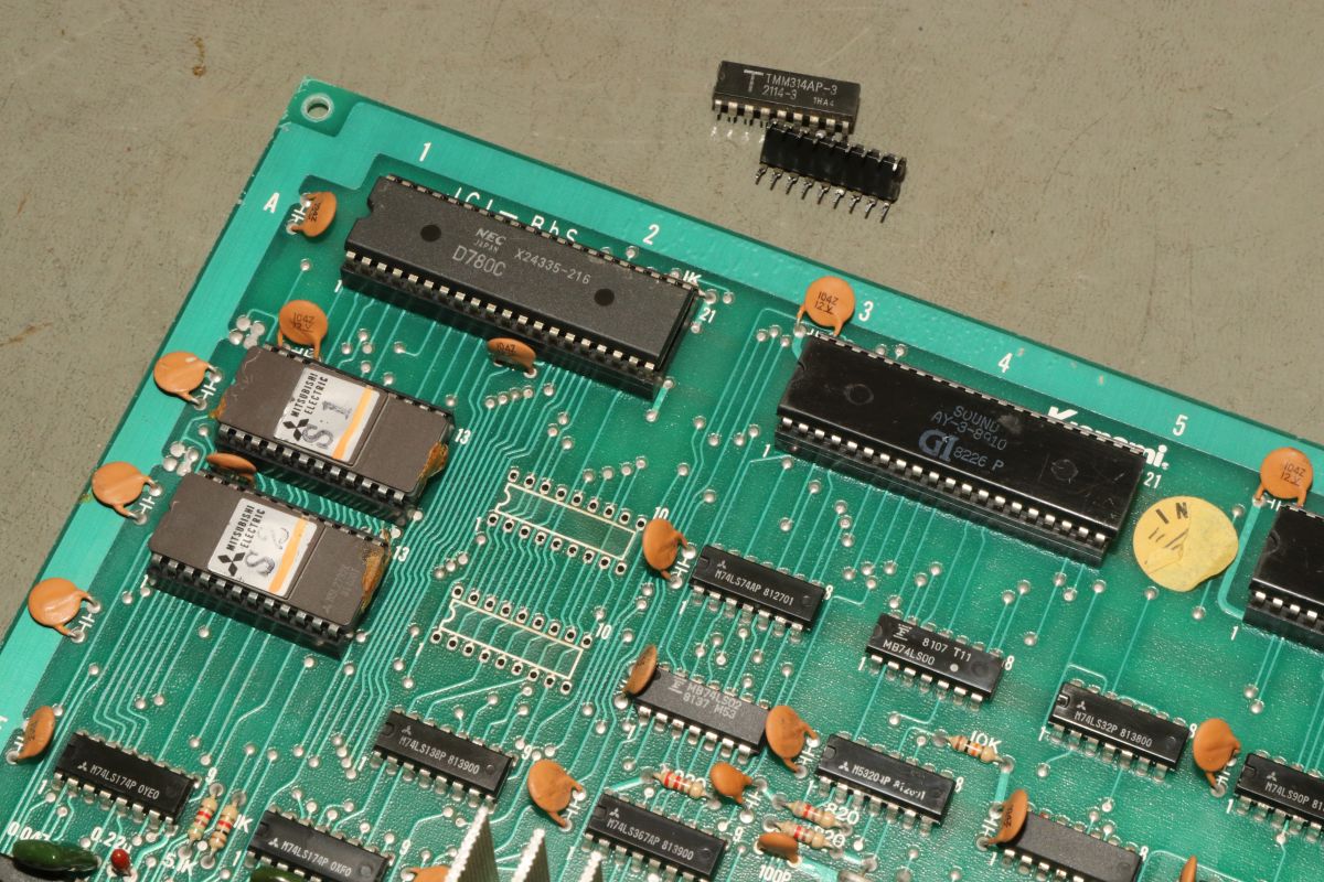 25.11.2025 {Tactician} Nach zwei Fehlschlägen tut ein Erfolg mal wieder richtig gut. Aber ein Schritt nach dem anderen. Mich erreichte eine Tactician ohne Ton, ein seltenes und ziemlich unbekanntes Spiel von Konami. Zu Tactician findet sich kein Schaltplan, aber Loco-Motion hat fast den selben Aufbau - Die Soundplatine ist sogar identisch. Das Bild war gut. Tactician sieht man nicht alle Tage: Langer Suche kurzer Sinn: der Sound-Z80 lief pegelmäßig ganz gut, der Ton war aber völlig stumm. Am Verstärker lag es nicht, der zirpte leise vor sich hin. Nach längerem Messen fiel mir auf, das vier von acht Datenbits ziemlich schlapp aussahen. Außerdem hängte sich der Z80 immer mal wieder auf. Vier Bit von acht? Das schreit förmlich nach 2114 RAMs. Huckepack hatten wir plötzlich Ton! Nicht gut, aber schon fast richtig. Ich habe vorsichtshalber gleich beide gewechselt: Die guten 2114 aus Keramik halten hoffentlich ewig! Und nachdem ich dann auch noch einen der Soundprozessoren gewechselt hatte, war wieder alles gut! Hier noch ein paar Impressionen der Platine. Diese vielen PROMs übersieht man leicht - sie sind auch nicht gesockelt. Die Soundplatine in sehr hoher Auflösung: Der Vollständigkeit halber auch von unten: CPU und Video in Hi-Res: Und hier das ganze Ensemble: |