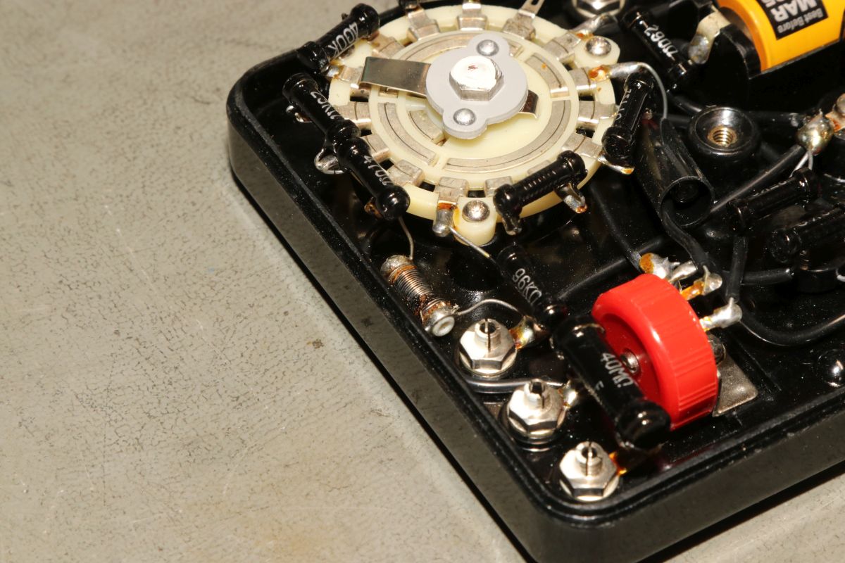 06.10.2025 {Kosmos Multimeter Ultron UM201E} Die Kosmos-X-Experimentierkästen verweisen des Öfteren auf ein passendes Multimeter, um den Erfolg der Aufbauten auch messtechnisch überprüfen zu können. Arme Leute haben dafür das mitgelieferte Galvanometer (Spule plus Kompassnadel) genutzt, Poser durften bei Kosmos das schöne Ultron UM201E kaufen. Dieses formschöne Instrument im Bakelitgehäuse wurde in gleicher oder leicht abgewandelter Form auch unter anderen Namen und Firmen vertrieben: TEVATEST MS-202T, MONACOR MT-202C, NORIS 620SPN, SEC M62D (Radio RIM), 200H - und vermutlich noch vielen mehr... Alle Geräte waren einfach aufgebaut und mit einem 38µA Drehspulmesswerk ausgestattet. Jetzt habe ich die Kästen, da muss der Vollständigkeit halber auch das Messwerkzeug her: High Quality. Was sonst? Die Box ist wertig. Das Messgerät darinnen ist in der Tat erstaunlich. Das schwere Bakelitgehäuse liegt satt in der Hand, das Drehspulmesswerk mit Spiegelskala ist gut ablesbar und sauber gedämpft. 1969... da war ich zwei Jahre alt und habe mich sicher noch nicht für so etwas interessiert... Die Bedienelemente sind überschaubar: ein Drehknopf für die Bereichswahl, ein Masseanschluss und ein Plusanschluss, sowie ein separater Hochvoltanschluss. Der obere rechte Anschluss ist für Kapazitätsmessungen gedacht. Dieses Produkt ist für die Firma SEC gelabelt... Wer das wohl hergestellt hat? Das Messgerät ist ziemlich intuitiv bedienbar. Eine Schraube hält die Rückwand. Die Batterie (die man hätte beizeiten entsorgen sollen...) ist für die Widerstandsmessung da. Sehr viel ist da jetzt nicht drin... Grünspan. Eine Drahtbürste und ein Glasfaserradierer machen alles wieder gut. Die Polung sollte beachtet werden, sonst schlägt das Messwerk in die falsche Richtung aus... Bereit für die Arbeit! Ein kleines, aber feines Detail: ein Kupferoxydul-Gleichrichter. der hat zwar miese Sperrstromwerte aber eine unschlagbar niedrige Vorwärtsspannung. Die Schraube presst die Kupferoxyd-Plättchen zusammen - ich dachte zuerst, das wäre ein Abgleichkondensator... Der Rückdeckel verrät nur seine Herkunft... Mit neuer Batterie ist die Widerstandsmessung schon mal exzellent! Die Spannungsmessung hingegen ist in allen Bereichen falsch, die Werte sind viel zu hoch. Das liegt an einem durchgebrannten 47Ohm Widerstand im Strommesskreis. Hier ist alles miteinander verbastelt, wen da was durchbrennt, stimmt auch die Spannungsmessung nicht mehr. Provisorisch ersetzt. Ist jetzt nicht so 100% genau und vor allem nicht überlastfest - aber es geht! Jetzt habe ich die Kosmos-Experimentierwelt ziemlich komplett... Da sollte man mal einen Film drüber machen. ;-) {SEC M62D / Modell 200H Dokumentation} Hier ist der Scan der Bedienungsanleitung zum Multimeter.