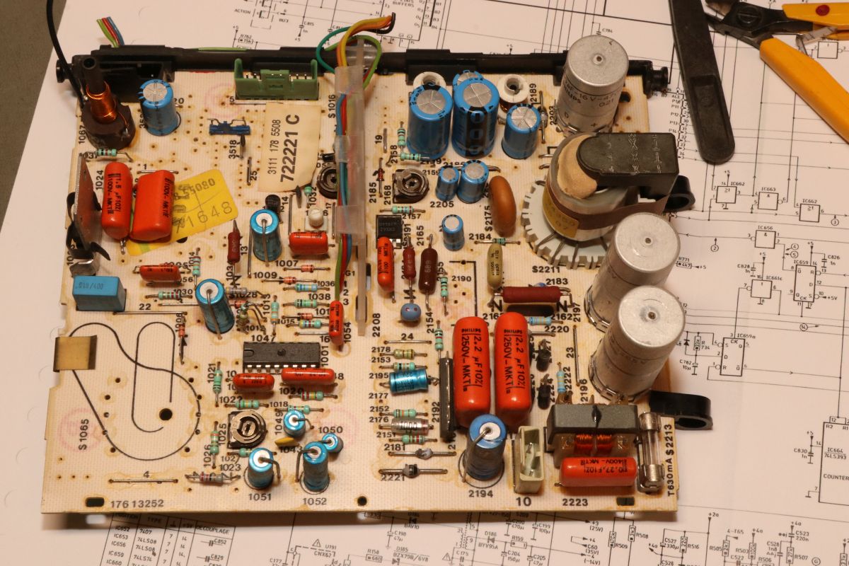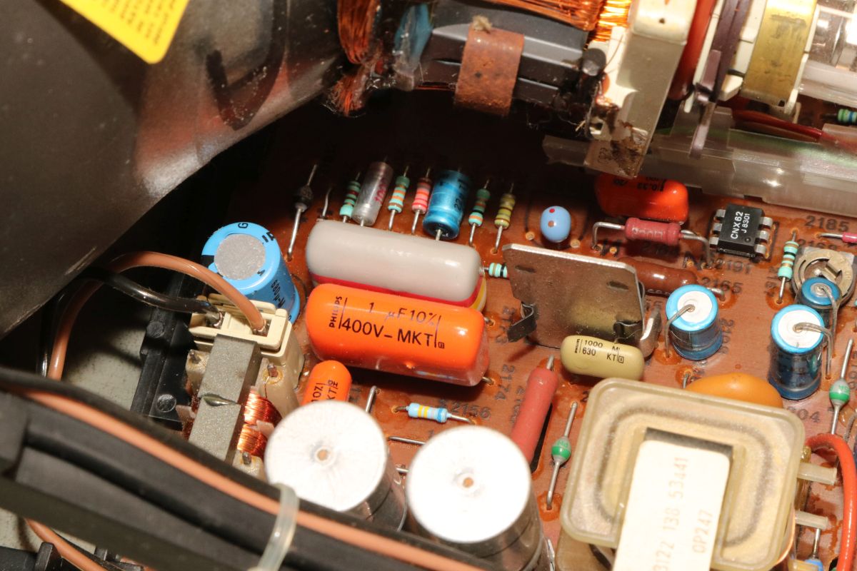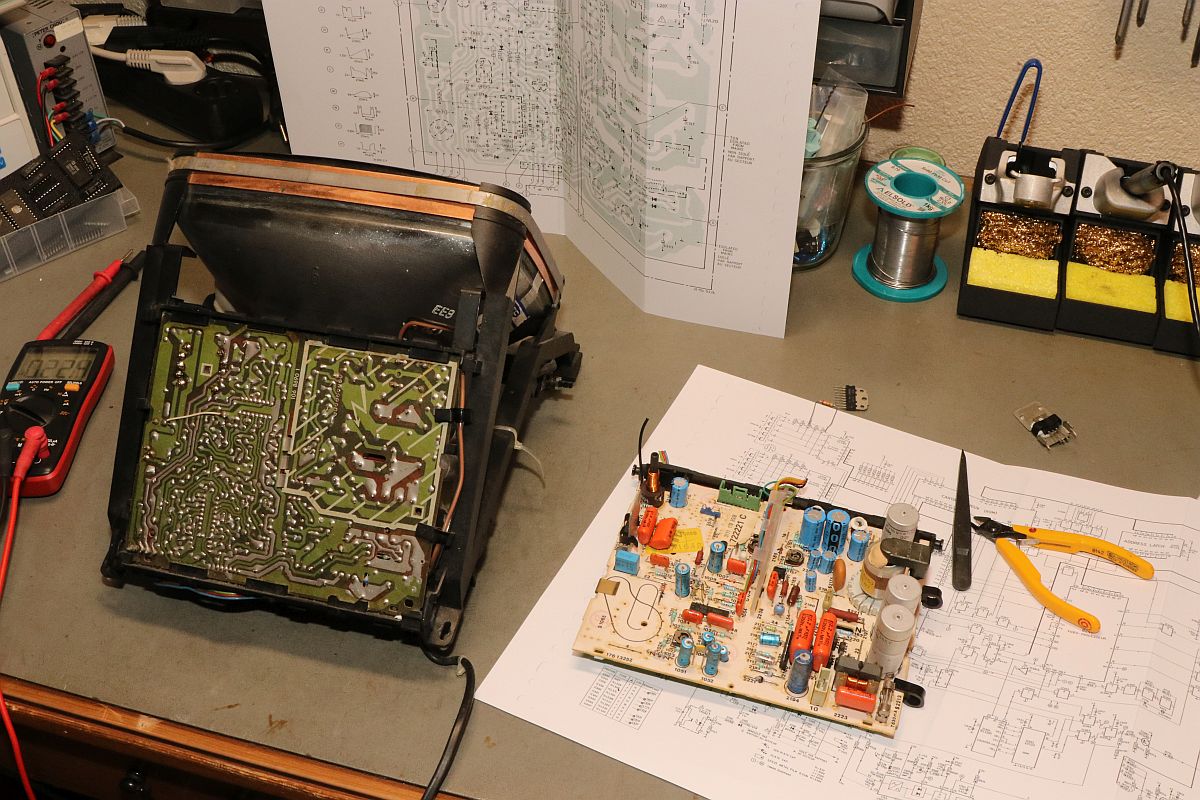 04.06.2025 {Radiola Jet 27} Philips G7200, Radiola Videopac Jet 27 - außer unterschiedlicher Gehäusefarbe und Bedruckung ist eigentlich überall das Gleiche drin. Das Radiola-Gehäuse sieht ganz edel aus... Alles ist in schickem Dunkelblau gehalten. Ob diese Konsolen wohl nur in Frankreich verbreitet waren? Mir sind sie bisher auf jeden Fall noch nicht über den Weg gelaufen. Der Patient sieht auf den ersten Blick eigentlich ganz gut aus... Die Monitoreinheit kennen wir schon vom Philips G7200. Hoppala, da fehlt doch was... Da hat wohl schon wer den Zeilentrafo "geerntet". Ein Monitor ohne Zeilentrafo ist quasi wertlos. (Ein Auto, das nicht fährt, das ist sein Geld nicht wert!) Gut, wenn man aus einem anderen französischen Telekommunikationsgerät einen fast baugleichen Monitor bekommen kann - hier passt zwar der Anschluss an die Digitalelektronik nicht... ... aber der ZTR sieht erstaunlich identisch aus! Beim Jet 27 fehlt auch die Leiterplattenhalterung... Die kann man auch dem Spendergerät entnehmen. Die S/W Zeilentrafos sind noch recht putzig. Das Typenschild ist kaum lesbar: Das Pinning ist mir zwar unbekannt, aber es sieht genau so aus, wie beim Original. Sodele: der Trafo ist verpflanzt, alles hat mechanisch gepasst. Leider weiß ich noch nicht, ob der ZTR auch elektrisch passt, weil das Schaltnetzteil nicht schaltet. Zwischenkreisspannung ist da, aber das war's dann auch. Ich bin gespannt, ob das alles zu einem guten Ende führt! {Radiola Jet 27 Reparatur} Es lag eine Weile rum, aber jetzt ist es dran. Zur Not hab ich auch gleich noch eine Schlachteplatte dazu... Die sieht aber deutlich anders aus als das Original - bis auf wenige Bauteile war eigentlich nur der ZTR extrem brauchbar. Die Diode vom Kondensatornetzteil sieht auch nicht gut aus. Vielleicht verlasse ich mich doch besser auf Neuteile. Gut, dass es zum Gerät ein ausführliches Schaltbild gibt! Da das Netzteil nicht anläuft, stürze ich mich mal auf diesen speziellen Bereich. Die Zwischenkreisspannung liegt an, das Kondensatornetzteil für den Schaltregler liefert nicht, was es soll... Die fetten Folienkondensatoren sind in Ordnung - bei 400V-Typen hätte ich auch nichts anderes erwartet. Die Gleichrichterdiode ist durchlegiert - dann kann das mit den 16V auch nicht klappen. Eigentlich ist hier eine Schottky Diode geplant - die eingesetzte 1N4148 war definitiv nicht das, was im Schaltplan steht und vermutlich etwas knapp dimensioniert. Aus Mangel an Alternativen spendiere ich eine 1N4004. Die hält sicher. Voila! Das Netzteil startet. Und startet. Und startet... Hickup Mode. An den Kondensatoren liegt es diesmal nicht, dafür am Strom, der über den Lastwiderstand Richtung Monitor abfließen möchte... Wenn eine Stromsenke einen festen Innenwiderstand von 220 Ohm hat, dann verheißt das nichts Gutes... Man suche bei den blauen Kondensatoren. Was macht der blaue Kondensator? Er hat 0,0 Ohm... ... was natürlich die 220 Ohm erklärt. Der Kondensatortausch macht mich glücklich! Das Spiel läuft, der Monitor ist hell und scharf. Der Zeilentrafo war wohl offensichtlich das gleiche Modell! Jetzt wieder ein kompletter Tausch der alten Elkos - die haben es echt nötig... - dann bin ich fertig. |