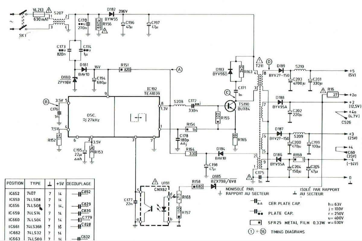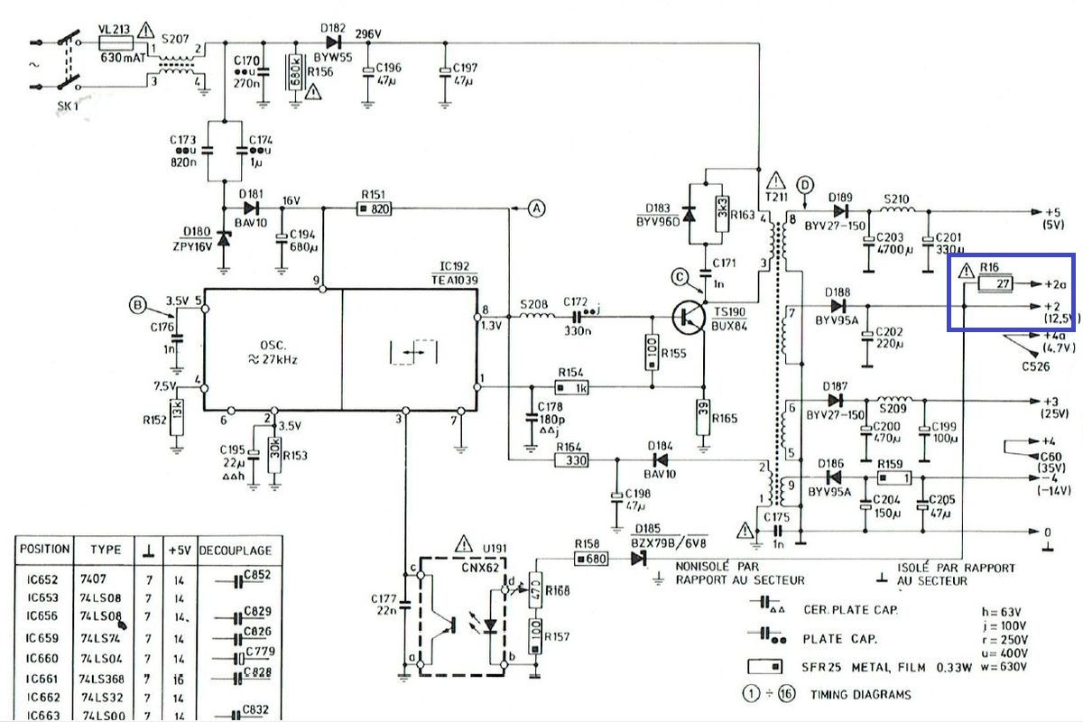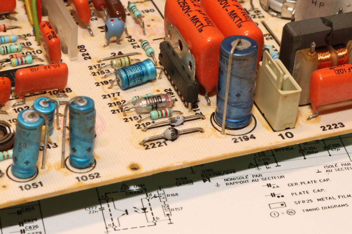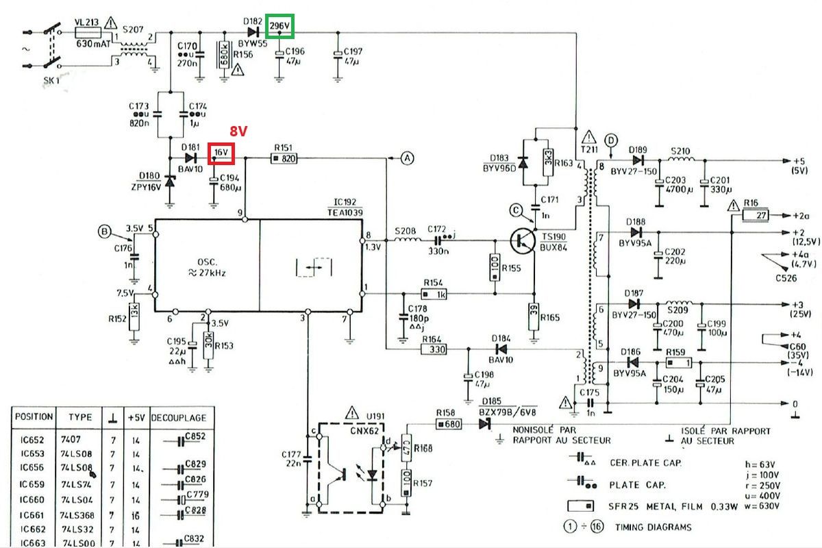 04.06.2025 {Radiola Jet 27} Philips G7200, Radiola Videopac Jet 27 - außer unterschiedlicher Gehäusefarbe und Bedruckung ist eigentlich überall das Gleiche drin. Das Radiola-Gehäuse sieht ganz edel aus... Alles ist in schickem Dunkelblau gehalten. Ob diese Konsolen wohl nur in Frankreich verbreitet waren? Mir sind sie bisher auf jeden Fall noch nicht über den Weg gelaufen. Der Patient sieht auf den ersten Blick eigentlich ganz gut aus... Die Monitoreinheit kennen wir schon vom Philips G7200. Hoppala, da fehlt doch was... Da hat wohl schon wer den Zeilentrafo "geerntet". Ein Monitor ohne Zeilentrafo ist quasi wertlos. (Ein Auto, das nicht fährt, das ist sein Geld nicht wert!) Gut, wenn man aus einem anderen französischen Telekommunikationsgerät einen fast baugleichen Monitor bekommen kann - hier passt zwar der Anschluss an die Digitalelektronik nicht... ... aber der ZTR sieht erstaunlich identisch aus! Beim Jet 27 fehlt auch die Leiterplattenhalterung... Die kann man auch dem Spendergerät entnehmen. Die S/W Zeilentrafos sind noch recht putzig. Das Typenschild ist kaum lesbar: Das Pinning ist mir zwar unbekannt, aber es sieht genau so aus, wie beim Original. Sodele: der Trafo ist verpflanzt, alles hat mechanisch gepasst. Leider weiß ich noch nicht, ob der ZTR auch elektrisch passt, weil das Schaltnetzteil nicht schaltet. Zwischenkreisspannung ist da, aber das war's dann auch. Ich bin gespannt, ob das alles zu einem guten Ende führt! {Radiola Jet 27 Reparatur} Es lag eine Weile rum, aber jetzt ist es dran. Zur Not hab ich auch gleich noch eine Schlachteplatte dazu... Die sieht aber deutlich anders aus als das Original - bis auf wenige Bauteile war eigentlich nur der ZTR extrem brauchbar. Die Diode vom Kondensatornetzteil sieht auch nicht gut aus. Vielleicht verlasse ich mich doch besser auf Neuteile. Gut, dass es zum Gerät ein ausführliches Schaltbild gibt! Da das Netzteil nicht anläuft, stürze ich mich mal auf diesen speziellen Bereich. Die Zwischenkreisspannung liegt an, das Kondensatornetzteil für den Schaltregler liefert nicht, was es soll... Die fetten Folienkondensatoren sind in Ordnung - bei 400V-Typen hätte ich auch nichts anderes erwartet. Die Gleichrichterdiode ist durchlegiert - dann kann das mit den 16V auch nicht klappen. Eigentlich ist hier eine Schottky Diode geplant - die eingesetzte 1N4148 war definitiv nicht das, was im Schaltplan steht und vermutlich etwas knapp dimensioniert. Aus Mangel an Alternativen spendiere ich eine 1N4004. Die hält sicher. Voila! Das Netzteil startet. Und startet. Und startet... Hickup Mode. An den Kondensatoren liegt es diesmal nicht, dafür am Strom, der über den Lastwiderstand Richtung Monitor abfließen möchte... Wenn eine Stromsenke einen festen Innenwiderstand von 220 Ohm hat, dann verheißt das nichts Gutes... Man suche bei den blauen Kondensatoren. Was macht der blaue Kondensator? Er hat 0,0 Ohm... ... was natürlich die 220 Ohm erklärt. Der Kondensatortausch macht mich glücklich! Das Spiel läuft, der Monitor ist hell und scharf. Der Zeilentrafo war wohl offensichtlich das gleiche Modell! Jetzt wieder ein kompletter Tausch der alten Elkos - die haben es echt nötig... - dann bin ich fertig. |