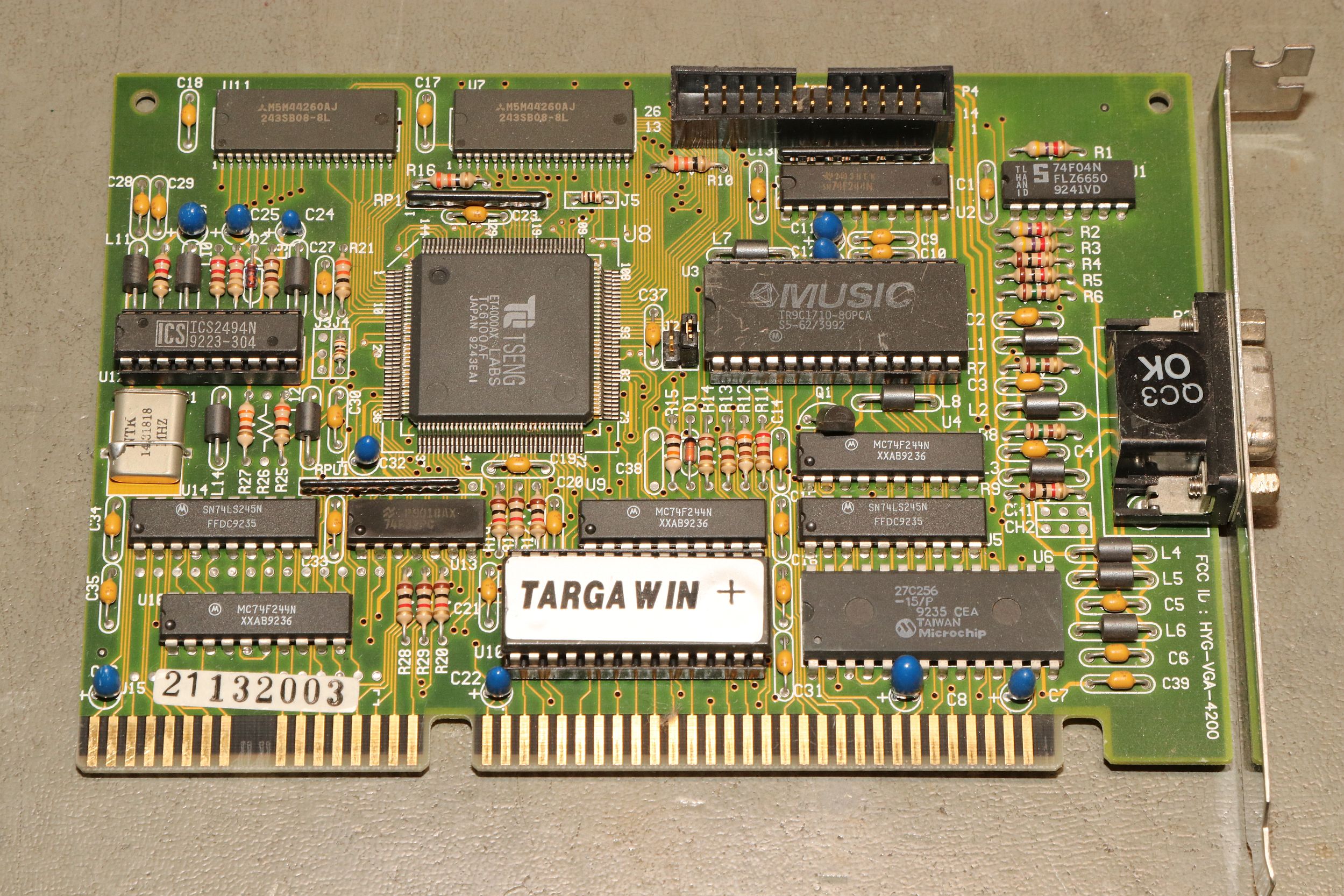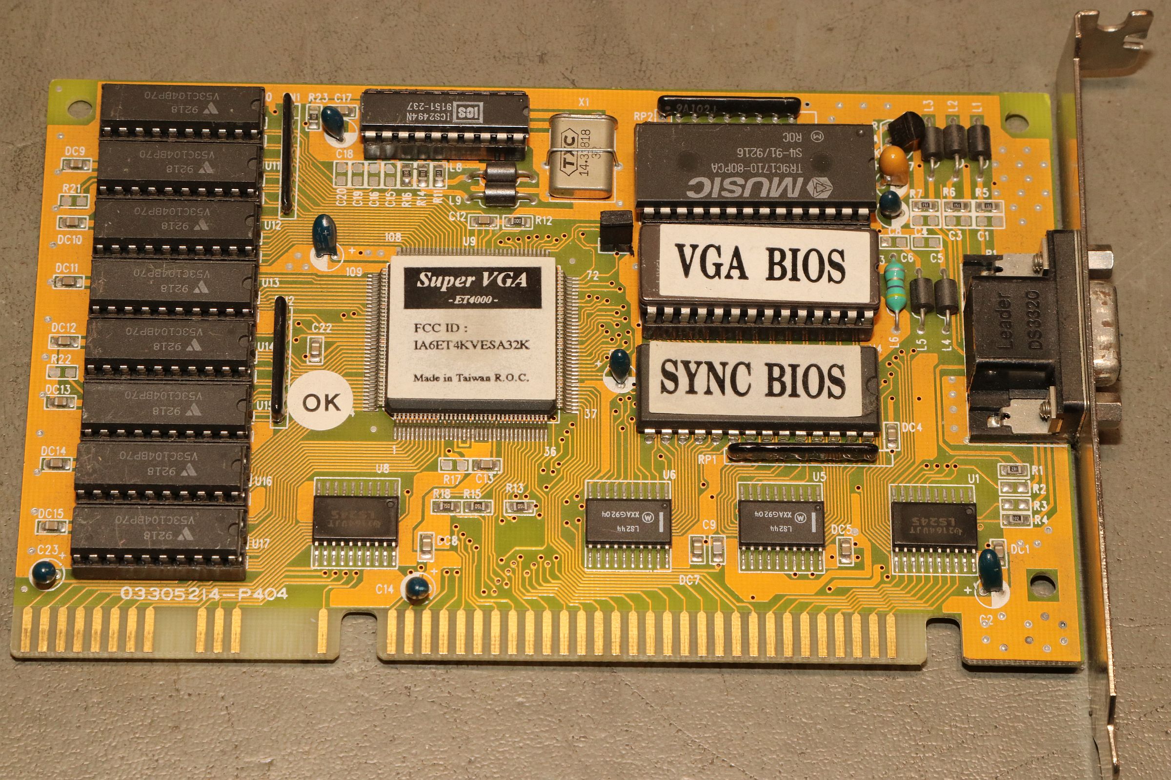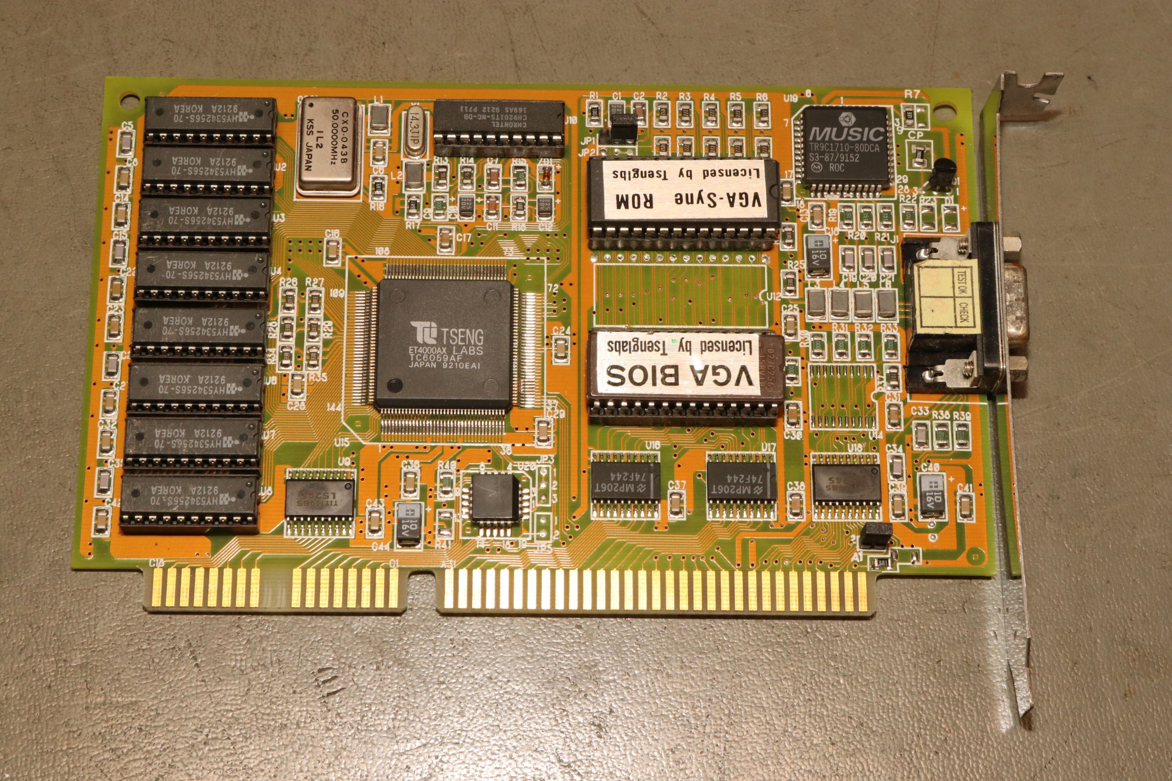 {TSENG ET4000} Wir schreiben das Jahr 1992. Die PC-Welt wird bunter und hochauflösender - grüne und bernsteinfabene Monitore gehören schon der Vergangenheit an und von den tollen CGA-Farben haben wir uns mental erholen können. EGA war nur eine kurze Episode, jetzt ist VGA angesagt. TSENG liefert die Karten, die im Nachgang als der Quasi-Standard der leistungsstärksten VGA-Karten ohne Beschleunigung gelten: ET4000. Kein 3-D, keine Shader, kein Gedöhns, dafür rasend schneller Video-RAM-Zugriff. Die TSENG ET4000 war DIE Grafikkarte, die damals jeder haben wollte. Die Karten waren eigentlich alle gleich aufgebaut: ET4000-Chip, 1MB RAM, BIOS-ROM, SYNC-ROM, programmierbarer Takt-PLL und RGB-D/A-Wandler. Diese hier besticht sogar durch einen Schreibfehler beim Sync-ROM-Aufkleber.