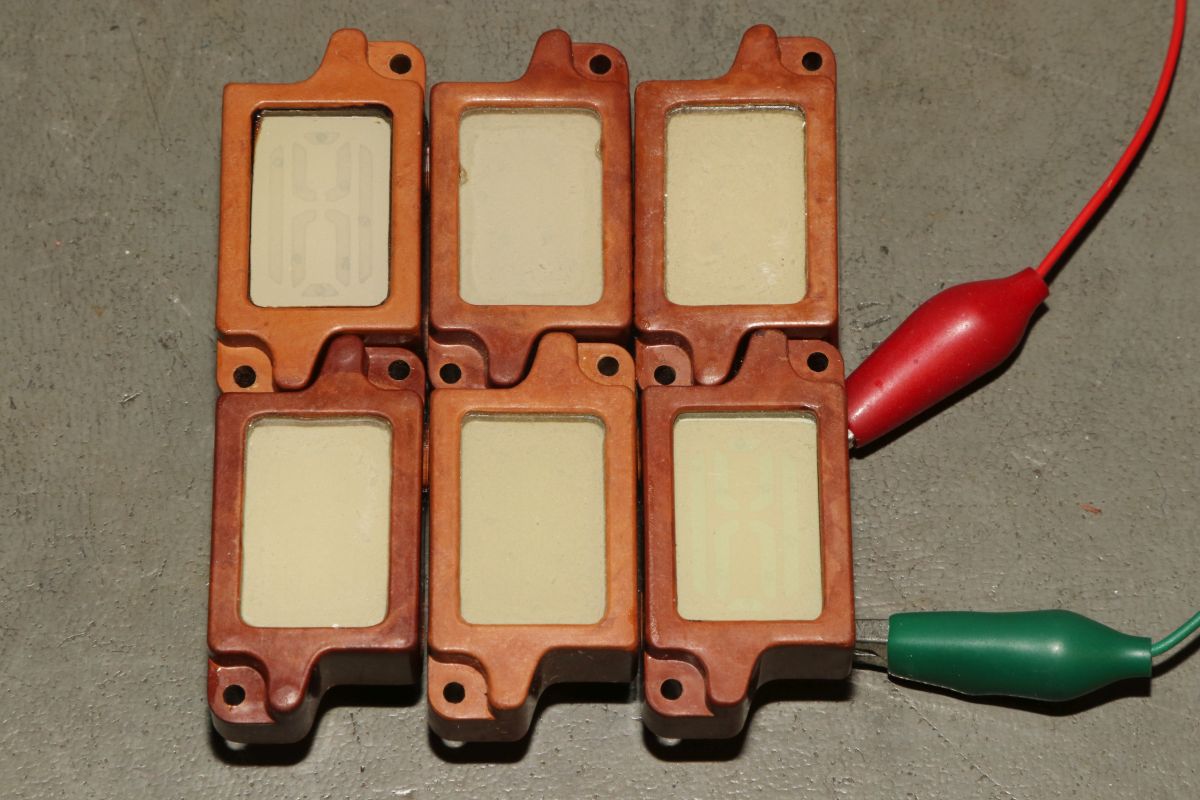 {IEL-0-IV EL-Display} Sowjetische Displaytechnik des letzten Jahrtausends ist stets für Überraschungen gut. Wer sonst kam auf die Idee, Elektrolumineszenzfolien als Displayelemente zu verwenden? Der Vorteil: jede beliebige Segmentform ist ohne großen Aufwand möglich. Der Nachteil: die Dinger sind dunkel, brauchen 150V Wechselspannung und die Haltbarkeit ist grenzwertig. Es gibt Gründe, warum sich das nicht durchgesetzt hat. Hier sehen wir Displays des Typs ИЭЛ-0-IV