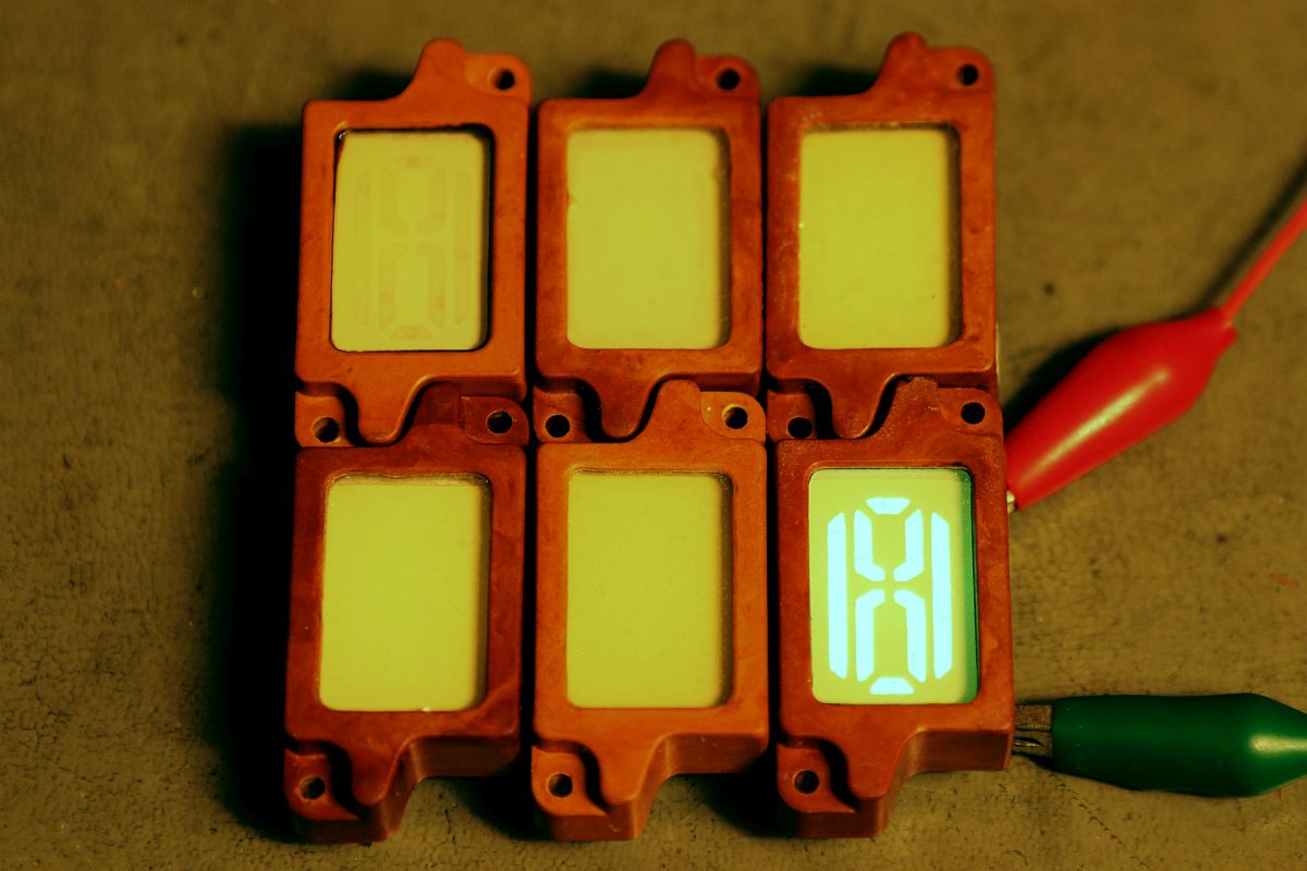 Mit einem winzigen EL-Folien-Iverter lassen sich diese Displays betreiben: hier leuchten alle verfügbaren Segmente. Zum Ablesen sollte man die Zimmerbeleuchtung abschalten, sonst wird das nichts. Als Nachtfluginstrumente in Kampfjets wird man allerdings auch bei widrigsten Umständen nicht geblendet...