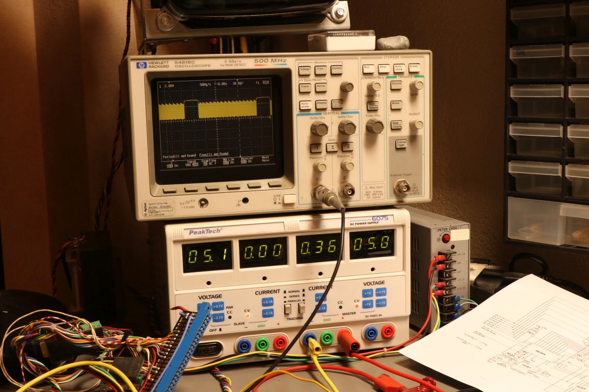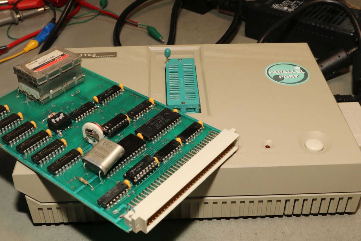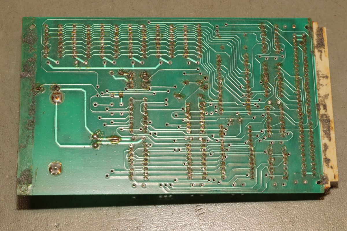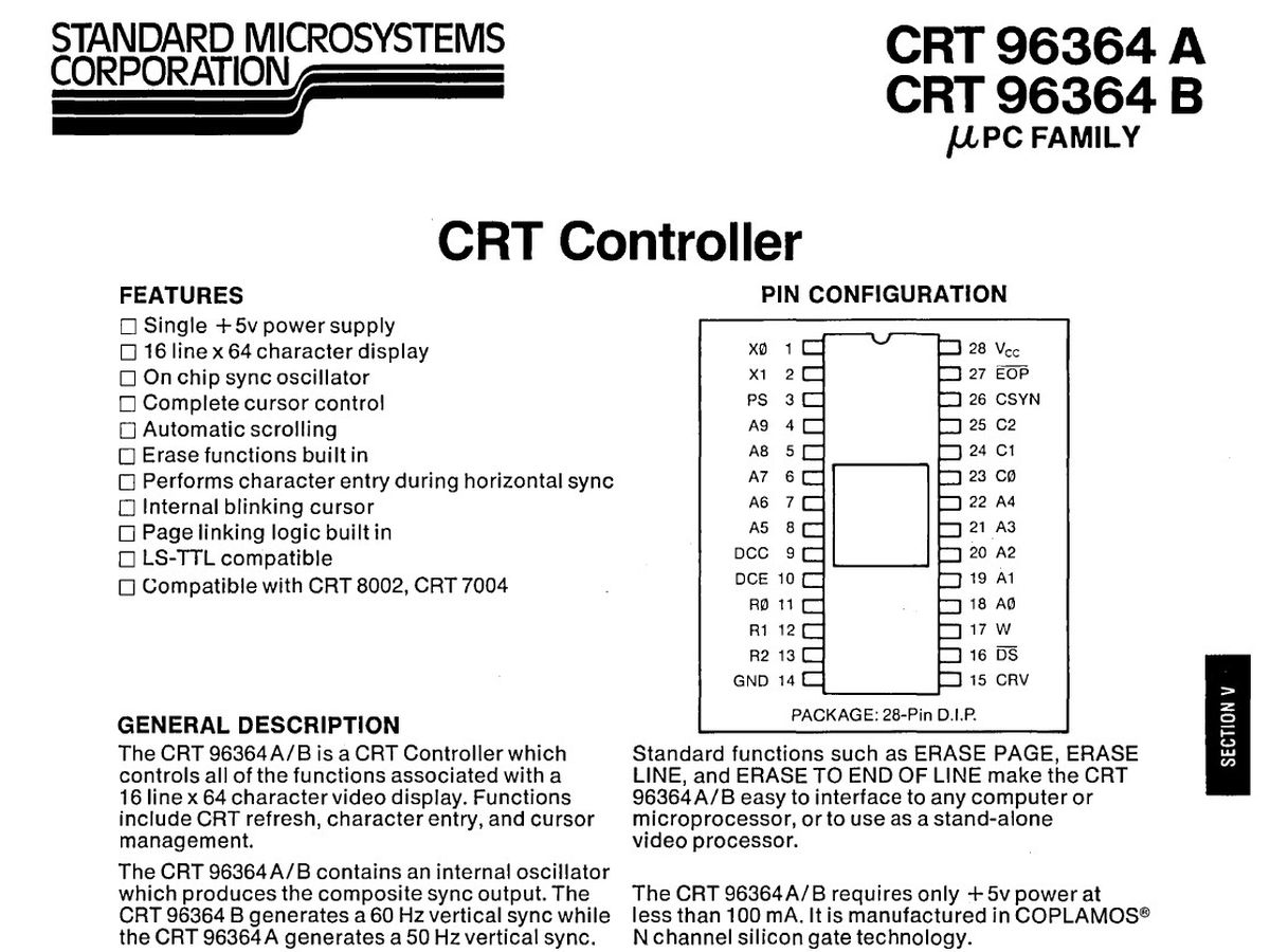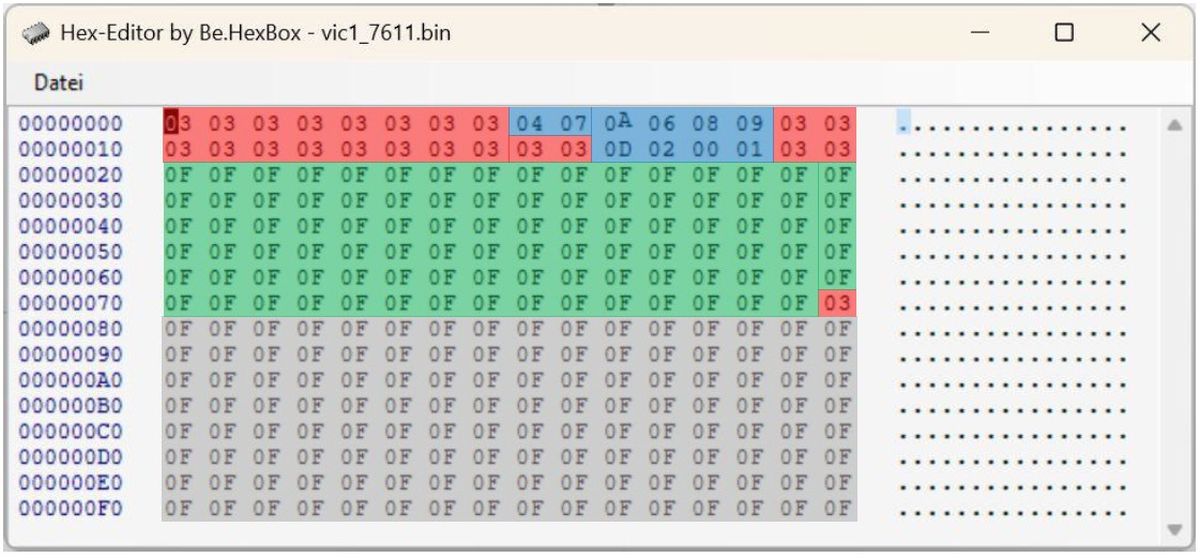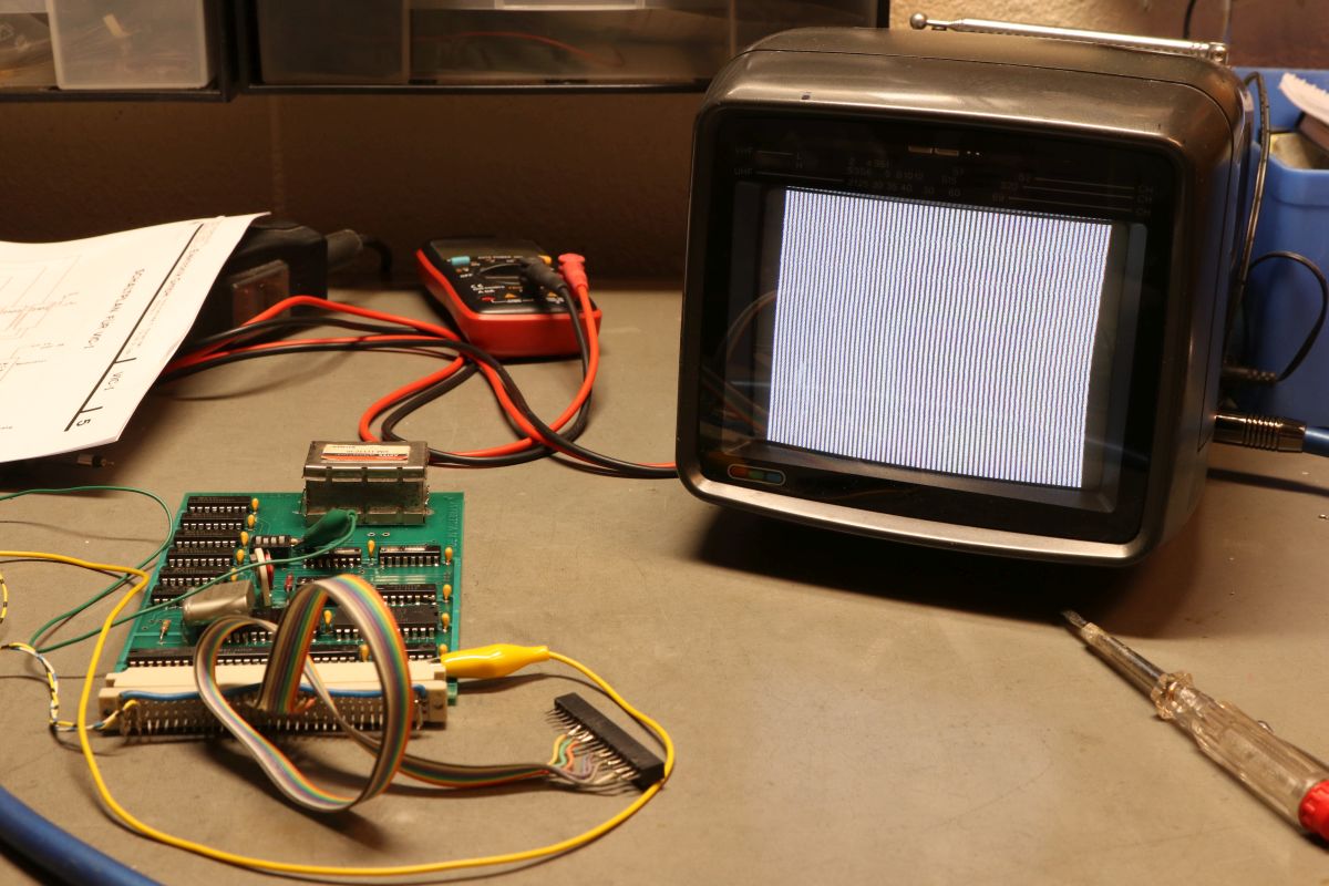 18.09.2025 {Eltec VIC-1} Grafikkarten 1979... eine Geschichte voller Auflösungslosigkeiten. In der Zeit, in der Eltec diese Grafikkarte für seinen Eurocom1 auf den Markt gebracht hatte, war man froh, mehr als ein paar Siebensegmentanzeigen zu haben. Das Anzeigegerät war ein Fernseher, die Anzeigeart war ein Textbildschirm, Grafik war noch nicht verfügbar. Mir lief eine Karte zu, der man die Jahre schon deutlich ansieht: Der deutlich korrodierte TV-Modulator (Typ ZX-81) wurde zusätzlich mit einem Videoausgang bewaffnet... Warum sauber einbauen, wenn man auch kleben kann? Nach einer Reinigungsorgie mit diversen Lösemitteln erstrahlt die Karte wieder in altem Glanz. Passend dazu habe ich mal alle Abblockkondensatoren wieder bestückt, die entweder abgebrochen oder gar nicht eingelötet waren. Im Schaltplan werden diese Kondensatoren (obwohl die Lötaugen dafür vorhanden sind) nicht erwähnt. Nicht alle Durchkontaktierungen haben überlebt, aber die Karte sieht ganz ordentlich aus... Das Character-ROM CGR-001 liefert die Pixeldaten für die ASCII-Zeichen, der Grafikbaustein unter dem 1,000MHz Quarz ist ein CRT96364, er kümmert sich um die RAM-Adressierung, die Spaltenauswahl und das Timing. Der HSYNC-Takt ist bekannt... ein astreines Fernseher-Signal. Schön, dass der 96364 einfach arbeitet, ohne vorher konfiguriert werden zu müssen. Und wir haben ein stehendes Bild. Die Streifen gehen vermutlich erst weg, wenn der Controller den Befehl "Clear Screen" bekommt. Das macht er dann ganz automatisch. 360mA sind vermutlich weniger, als eine Hochleistungs-Grafikkarte heutzutage so braucht, aber wir hatten damals ja nur wenig Strom zur Verfügung... ;-) Eltec hat auch ein rudimentäres Schaltbild zur Karte geliefert und ich dachte schon, schöne Ingenieursleistung! ... bis mir das Applikationsbeispiel aus dem 96364 Datenblatt in die Hände fiel... Eigentlich ein schöner einfacher Grafikcontroller mit geringfügiger Intelligenz - genau der Baustein, den man damals in einem Terminal brauchte. To Do: Programmieren! {Gut gesteuert durch ein PROM} Unauffällig auf der Platine versteckt befindet sich noch ein bipolares Prom 256x4 bit. Harris M3-7611-5 (82S129) bietet 256 4-Bit-Worte. Die werden dafür verwendet, um je nach ASCII Code am Eingang die entsprechenden Command Codes für den CRT Controller zu erzeugen und gegebenenfalls das RAM-Write-Signal zu triggern. Da interessiert mich doch jetzt mal, was im PROM drinsteht - je nach Grafikkarten gibt es verschiedene Versionen. Einen Sockel und einen Auslesevorgang später bin ich schlauer: die ersten 32 ASCII-Charakter sind Steuerzeichen, von denen nur wenige Beachtung finden. Bis 0x7E werden dann alle Zeichen dargestellt und im Video RAM gespeichert. 0x7F ist [DEL] und wird auch wieder ignoriert. 0x80 bis 0xFF wird nie angesprochen, da das höchstwertige Adressbit auf festem Potential liegt... Somit ist funktional alles erklärt. Jetzt muss ich nur einen Kleinrechner wählen, der mir ein Bild zaubert! Hier noch das Handbuch von Eltec und der Inhalt des Decoder-PROMs (M3-7611-5 / 82S129) als Binärdatei: