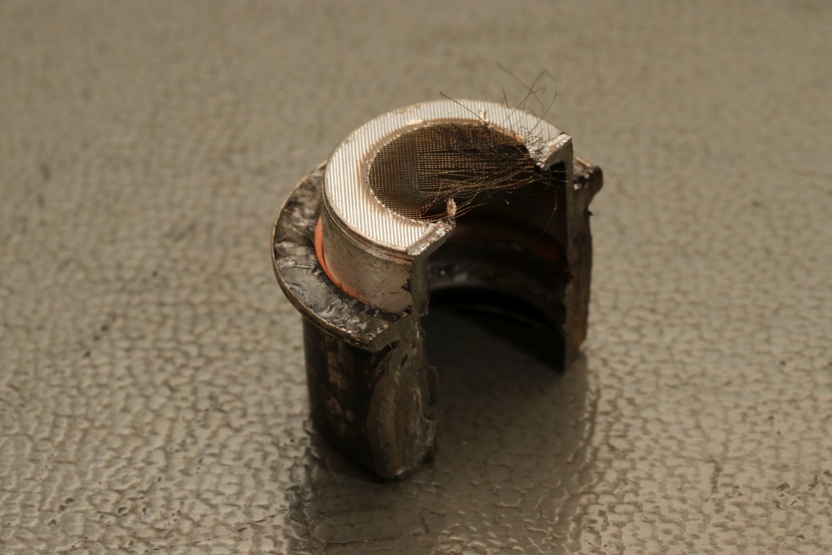 {2C39A obduziert} Mich hat immer schon interessiert, wie diese Scheibenröhren wohl innen aussehen mögen - gut, dass es die 2C39A sehr häufig und auch mit Glasisolierung gibt. Ich griff zu Eisensäge und Schleifscheibe... Das Ergebnis sieht etwas wüst aus, aber man erkennt den inneren Aufbau sehr deutlich: Die Anode besitzt ein Gewinde für den Kühlkörper und den zugelöteten Stutzen für das Einfüllen des Hoch-Vakuums. ;-) Die montierte Anoden-Kühlkörpereinheit: Das Steuergitter ist wie die Anodenfläche und die Kathode völlig plan, deswegen Scheibentriode... Die indirekt geheizte Kathode ist mit einer Substanz beschichtet, die die Austrittsarbeit der Elektronen optimiert. Der Glühfaden befindet sich (hier nicht sichtbar) im Inneren des Zylinders. 100W Anodenverlustleistung bei 2,5GHz... so sieht es aus, wenn man das Glas zur Isolierung der einzelnen Teile entfernt hat. Das Ganze ist ein Wunderwerk der Werkstoff-Technologie: Der Kühlkörper aus Aluminium ist mit der Anode aus Reinkupfer und der Hülse aus Stahl verlötet und verklebt, dazu der Isolator aus Glas... Alles mus dicht halten und extremen thermischen Streß aushalten können... Also ich finde es cool. |