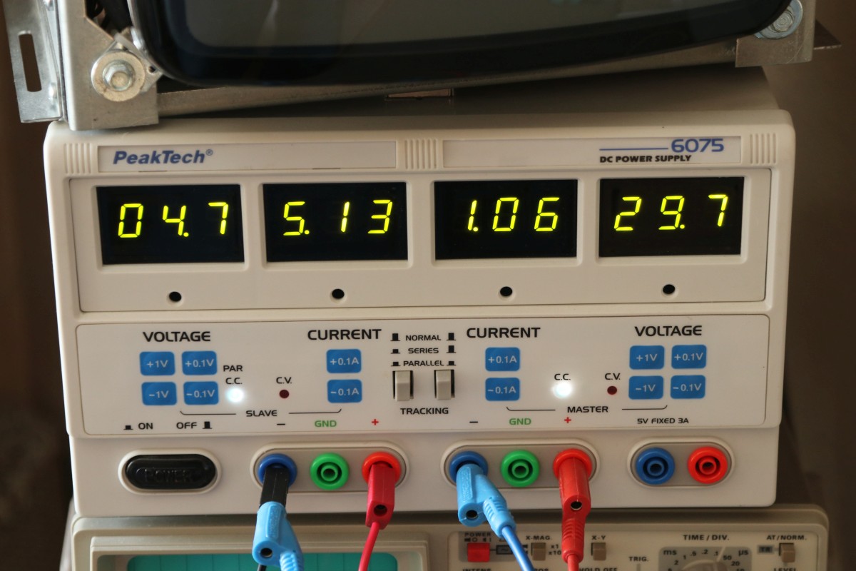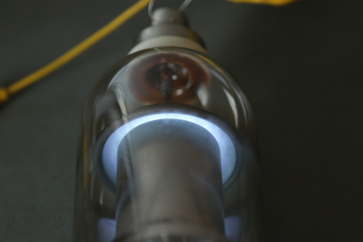 {AG872a - Hg-Gleichrichterröhre} Als hoch interessante Spende erreichte mich ein Quecksilberdampfgleichrichter von AEG. Diese Röhren sind speziell, erstens sind sie nicht so ganz RoHS-konform und zweitens kann man sie mit relativ geringen Spannungen testen! Das Datenblatt verrät uns einiges über die doch recht einfache Funktion. 5V Heizspannung bekomme ich her - die 7A dafür werden allerdings mit meinem Netzteil nicht erreicht... Die Röhre hat 10kV Sperrspannung aber eine Zündspannung von nur 30V - da sollte doch was zu sehen sein... Die röhrentypische Vorwärtsspannung von 15V hat dafür gesorgt, dass sich Gleichrichterdioden bei niedrigen Betriebsspannungen durchgesetzt haben - im Bereich der Gleichstrom-Bahnen waren diese Hg-Gleichrichter allerdings noch sehr lange in Betrieb. Ich lege mal die Heizspannung an... Nach einigen Sekunden bildet sich ein Quecksilberniederschlag am kühlen Glasgehäuse: Das Netzteil gibt alles für die Heizung... Die Diodenspannung habe ich per Hochlastwiderstand mal auf erträgliche 1A eingestellt - was bei 15V Vorwärtsspannung auch 15W Verlustleistung bedeutet. Und schon leuchtet der Quecksilberdampf in geheimnisvollem Blau! "Was macht das blaue Licht? - "Es richtet gleich!" Sieht toll aus und heizt wie verrückt! Man sollte aufpassen, dass die Röhre heil bleibt, solange ist sie auch völlig ungiftig! |