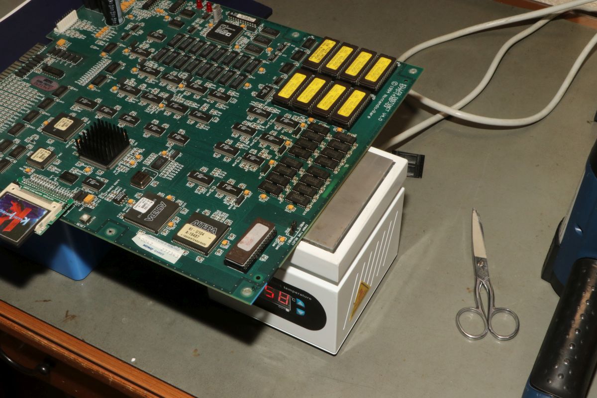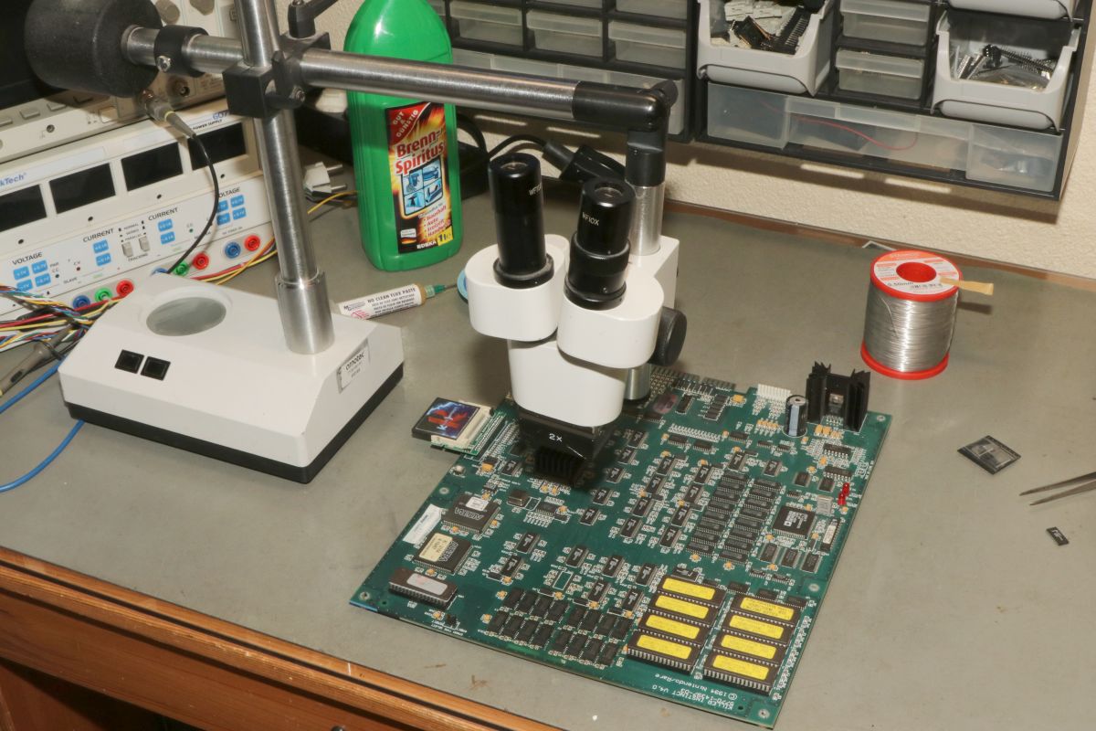 16.02.2026 {Killer Instinct} Midway? Nintendo? Rare? Keine Ahnung, wer sich jetzt für dieses Geschwür aus SMD-Bausteinen verantwortlich zeichnete, aber immerhin ist die Technik der Endzeit der Arcade-Ära ziemlich überschaubar. Sauber getrennte Blöcke aus Sound-DSP und Sound RAM/ROM, sowie Game-RAM und ein kleines Boot-EPROM sind klar zu identifizieren. Das eigentliche Spiel versteckt sich auf einer Festplatte und weil die nicht ewig hält, hier eben auf einer CF-Karte. Toll. Altera MAX 7000 PLDs, soweit das Auge reicht. Die moderne Form der Custom-Chips. Wenn die defekt sind oder ihre Programmierung (EEPROM) vergessen haben, dann war's das. Für den Ton: ADSP-2105-die günstige Variante der Analog Devices DSPs. Darunter befindet sich die zugehörige RAM-Speicherbank mit 16 Stück M628032 (32kx8) mit beeindruckenden 20ns Zugriffszeit. Für Spiel und Video: 16 Stück MT4C4001J dynamische RAMs 1Mx4 mit 60ns Zugriffszeit. Der Hauptprozessor befindet sich unter dem Kühlkörper: laut MAME eine MIPS 4600-based CPU. Die originale Festplatte wurde durch eine Compactflashkarte ersetzt. IDE ist halt IDE... Das Spiel startet nicht. Ein schmaler blauer Streifen baut sich immer wieder auf. Laut Netzfund deutet das auf defekte RAMs hin. Aber wie soll man die finden? Ich bin gespannt, ob ich an so einem modernen Teil etwas ausrichten kann. Erst mal die Pegel an den dynamischen RAMs testen, vielleicht hat ja auch einer der Bustreiber / Latches einen Schuss... Auf Druck oder Biegen der Platine verändert sich auf jeden Fall nichts, das macht eine kalte Lötstelle unwahrscheinlich. {Fehlersuche} Eine genaue Durchsicht mit dem Mikroskop erweckt Hoffnungen: Die ein paar Minuten später wieder enttäuscht werden - es ändert sich nichts. Entweder war es kein guter Kurzschluss oder er war nicht relevant. Die RAM-Bank am DSP heizt gut aber gleichmäßig. Die PLDs sind auch nicht auffällig. Die Main-CPU hat ihren Kühlkörper nötig. Aber auch hier gibt es keine offensichtlichen Auffälligkeiten. Die Bustreiber/Latches sind auch unauffällig, der linke untere Baustein ist ein anderer Typ, deswegen weniger warm... Die Programm-RAMs werden überhaupt nicht warm. Daten- und Adressbussignale sind alle unauffällig. Zur Kontrolle habe ich mal das Boot-ROM neu gebrannt (Any-IDE) - man weiß ja nie. Aber die EPROMs unterscheiden sich nicht und es funktioniert trotzdem nicht. Es bleibt mir wohl nichts anderes übrig, als passende RAM-Bausteine zu besorgen und diese Stück für Stück zu ersetzen... {RAM-Tausch extrem} Der endlose Aufbau eines blauen Balkens könnte ein RAM-Fehler sein - was liegt näher, als die RAMs zu tauschen? Auch wenn ich noch keinen Ersatz zur Hand habe, die alten RAMs können schon mal raus! Hierzu decke ich die übrigen Komponenten sorgfältig mit Alufolie ab, man will die alten Teile ja nicht unnötig stressen! Mit etwas Geduld und moderatem Luftstrom geht das ganz fix mit dem Heißluftfön. Die freien Pads werden mit viel Flussmittel und frischem Zinn für die Wiederaufnahme vorbereitet. Die Spenderriegel sind gekommen. Man bekommt zwar die RAMs nicht mehr - auf diversen PC-Speicherriegeln sind sie aber massenhaft verbaut. Ich habe gleich mal zwei geordert - man weiß ja nie... Der Heißluftfön hilft auch hier. Dank der geringen Platinenfläche geht das auch ganz fix und schonend. Auflöten möchte ich die RAMs nicht mit dem Fön, weil ich Sorge habe, dass der Luftstrom mir alles durcheinanderwirbelt. Deswegen habe ich mir mal fix meine Wekzeugausrüstung aufgestockt: eine Heizplatte für SMD. Mal am Spenderriegel testen: Flussmittel satt... Sauber verzinnen... Und einfach auflegen. Einige Sekunden später fließt das Zinn und der Baustein zieht sich in Position. Etwas Druck mit der Pinzettenspitze verbindet alle Lötstellen einwandfrei. Das war ja einfach. Dann probieren wir das mal mit der Killer-Instinct. Die Lötpads sind vorbereitet. Die Platine wird so gestützt, dass sie plan auf der Platte aufliegt. Es ist eine üble Arbeit, die Speicherchips so aufzulegen, dass sie nicht wegrutschen. Lötpaste wäre hier besser, die pappt gut. Aber leider habe ich keine zur Hand. 2 Minuten später ist alles aufgeschmolzen, der eine oder andere Baustein muss noch nachkorrigiert werden. Das Resultat ist gut aber nicht perfekt. Weil die Bausteine so eng beieinandersitzen, sieht man nichts. Das nachträgliche Durchklingeln der Verbindungen entdeckt drei offene Lötstellen, die ich mit der feinen Lötspitze nachbessern muss. Kontrolle ist hier also unabdingbar. Und letztendlich kam es auch noch zu einer kleinen Delamination der Leiterplatte - vielleicht sind die 260°C doch schon zu heiß gewählt. Egal: nachdem alles verbunden ist, läuft die Platine immer noch nicht. Jetzt messe ich jedes einzelne Signal durch. Alle Daten- und Adressleitunge enden an den entprechenden Treibern. RAS tackert so vor sich hin, aber CAS fehlt bei einer RAM-Gruppe. Das kann natürlich nicht funktionieren! Am Treibereingang des 74FCT162244 liegt es noch an... Also sind vermutlich die RAMs in Ordnung gewesen... Ohne CAS gibt es keine Adressierung. Die 16-Bit Driver sind übel. Selten und klein... Und die Impulsbreiten liegen unter 50ns... Ich weiß schon, warum mir ganz alte Technik lieber ist - man hat einfach mehr Platz! Ein 74FCT162244 in SSOP ist bereits bestellt... so etwas habe ich natürlich nicht auf Lager! {Treiber-Tausch} Mouser hat geliefert, genauer gesagt: ein freundlicher Forist aus dem Microcontrollerforum, der die Sammelbestellung organisiert hat! In der großen Verpackung liegt ein kleiner Gurtabschnitt mit zwei noch kleineren Bustreibern. Jetzt will ich es wissen! Die Platine von unten auf 180°C vorgeheizt und von oben mit dem Heißlftfön gefönt - der Baustein ist in wenigen Sekunden herunter. Durch die gezielte Wärme ist die Platine nur recht wenig gestresst, ebenso die umliegenden Bauteile. Die Pads werden sauber geputzt, duch die winzigen Abmessungen kann man hier nicht mit Amateur-Reflow arbeite