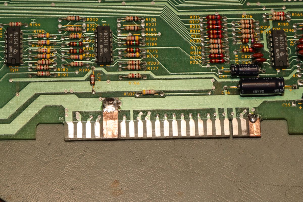 01.02.2026 {Pole Position} Hier hab ich mal wieder eine... Auslaufende Akkus, tonnenweise Customs, Kuchenblech-große Platinen und CPUs, die sonst niemand nimmt - was will man mehr. Zumindest hat schon jemand den Akku entfernt und grob geputzt! Allerdings ist überall irgendwas Klebriges drauf... Der typische PP-Brandschaden - Das Spiel hat einfach zu viel Power für die lümmeligen Steckverbinder! Die separaten Stromversorgungskabel sind hier mandatorisch! Ein sehr altes Spiel mit sehr guter Grafik (für die Zeit). Zwischen den Platinen befindet sich ein großzügig dimensioniertes Schaumstoffpad als Abstandshalter. Den Schaumstoff kann man mittlerweile wegpusten - hier muss was Besseres her. Als erstes muss ich mal die großflächigen Verätzungen besser reinigen. IC 6A sieht nicht gut aus, funktioniert aber noch. Erstmal nur sauberkratzen... Besser geht es nicht, zumindest sind jetzt keine ätzenden Rückstände unter dem Lötstoplack mehr vorhanden. Ein paar Kabel und KFZ-Steckverbinder reichen für einen rudimentären Anschluss. Toll. Immerhin haben wir ein Videobild. RESET# liegt auf 0,5V... das sollte so nicht sein. Um die CPUs zum Laufen zu zwingen, kann man mal hart +5V am linken Stecker einspeisen. Na, geht doch! Die CPUs laufen. Bis zum Speichertest. RAM 1 ist ein 2114 auf der Videoplatine: IC 7F. Tauschen und sockeln - mit guter Lötausrüstung geht das richtig fix! Wieder ein stehendes Bild ohne Grafik - aber das liegt am DIP-Schalter, der auf Freispiel gestellt ist! Da springt das Spiel direkt in die Start-Aufforderung. Drei DIP-Schalter später: Jetzt crasht nur noch der Wagen... Das ist der Bereich, der für den RESET zuständig ist. Denkbar simpel, ein Elektrolytkondensator lädt sich über einen Widerstand auf 5V auf und wird ggf. vom Watchdog Timer überstimmt. Wenn da keine 5V an der Klemme sind, dann könnte es am Elko liegen. Da werde ich wohl mal den Übeltäter ersetzen. {Dauerreset - warum?} Der Elko war es nicht - ebensowenig der Hex-Schmitt-Trigger-Inverter 4584 aka 40106... Aber das merkt man erst nach dem Tausch. Wer ist noch in der Open-Collector-Sammlung von Reset-Signalen beteiligt? Richtig! Der Watchdog-Timer. Und der sitzt direkt im Akku-Schmodder. Der 74LS161 war quasi richtig angefressen und hat den Dienst quittiert. Dauer-Reset! Jetzt hab ich wenigstens einen Grund, diese Ecke mal richtig zu reinigen. Und mit einem neuen Baustein läuft auch der Watchdog wieder ganz sauber und der Reset macht, was er soll: nach wenigen Sekunden die CPUs freigeben! Hier noch mal die Details auf dem Schaltplan: nicht immer ist alles, wie es zu sein scheint! Jetzt noch passende Kabel adaptieren und schon ist der Patient vollständig genesen! {Steckerreparatur} Der Vollständigkeit halber: Der Besitzer hat sich inständig eine Reparatur des Platinensteckers gewünscht. EMV-Kupferklebeband und Sekundenkleber sind hier sie wichtigen Utensilien. Aber Achtung: mit Sekundenkleber geklebte Leiterbahnen haben nicht annähern die Haftkraft, wir originale Kupferbahnen. Hier steckt man besser nur noch einmal mit sehr viel Gefühl! |