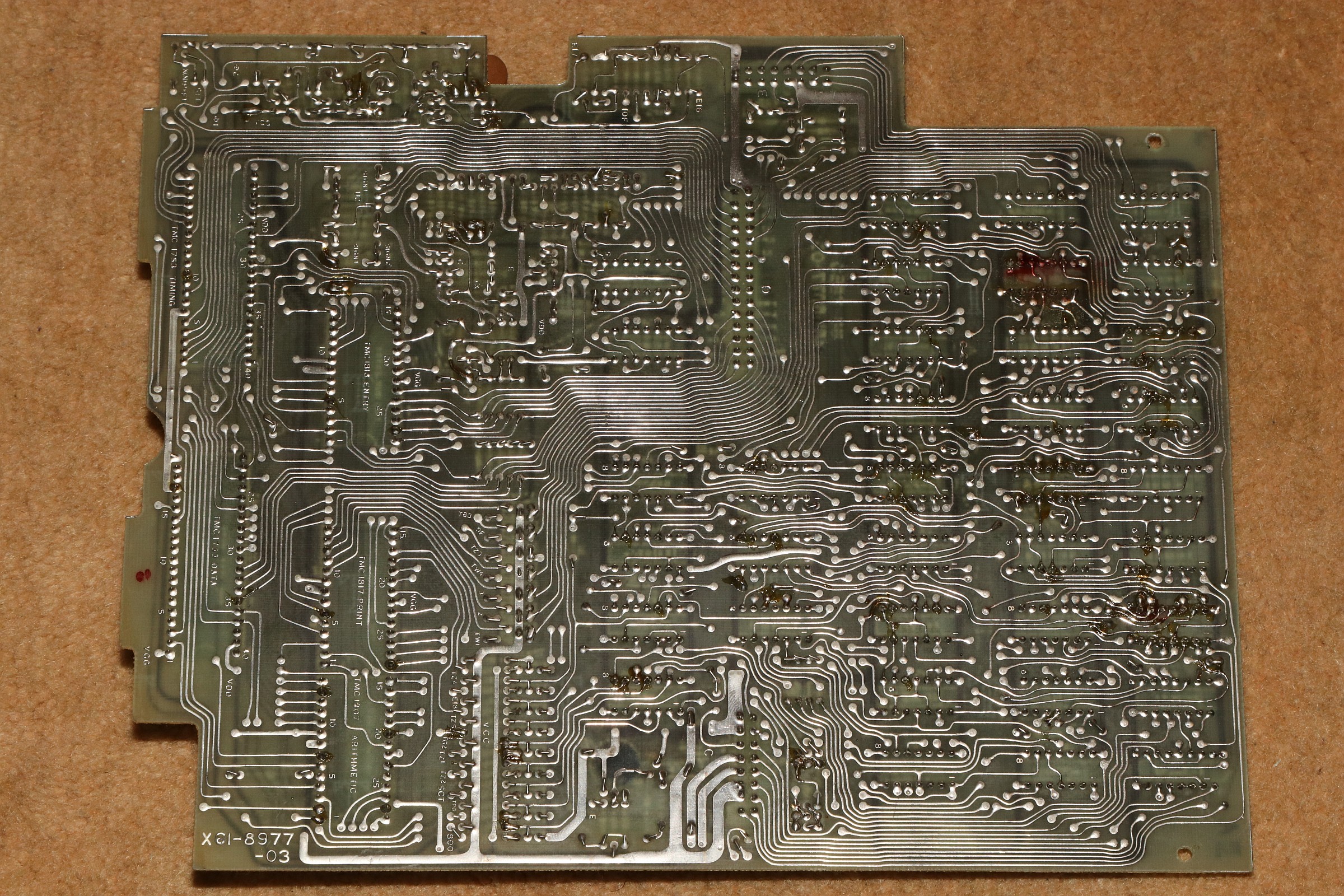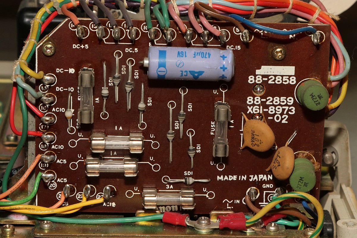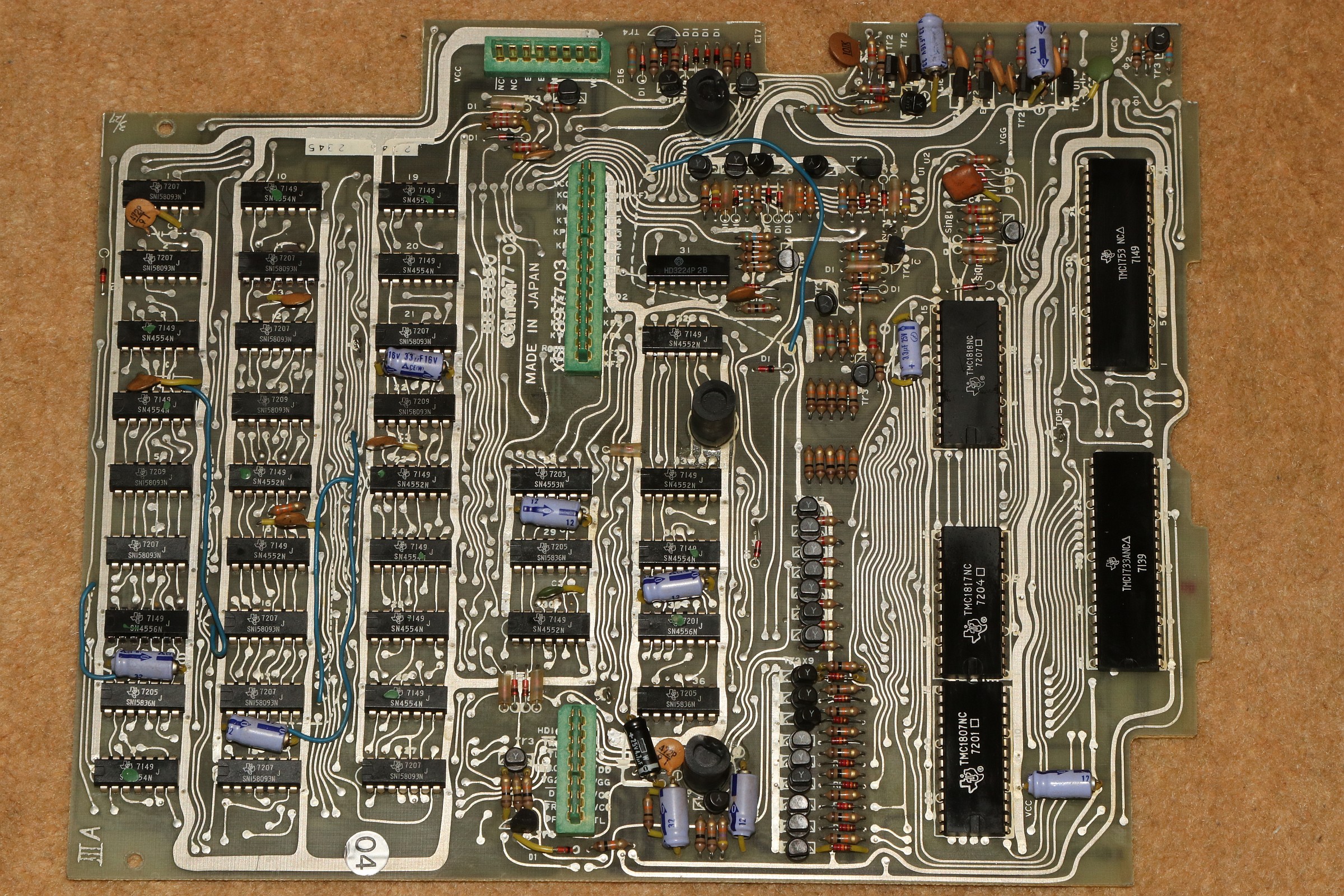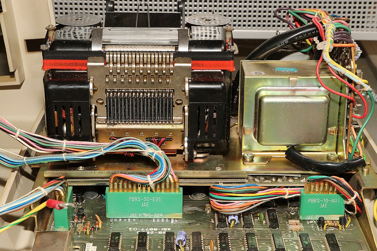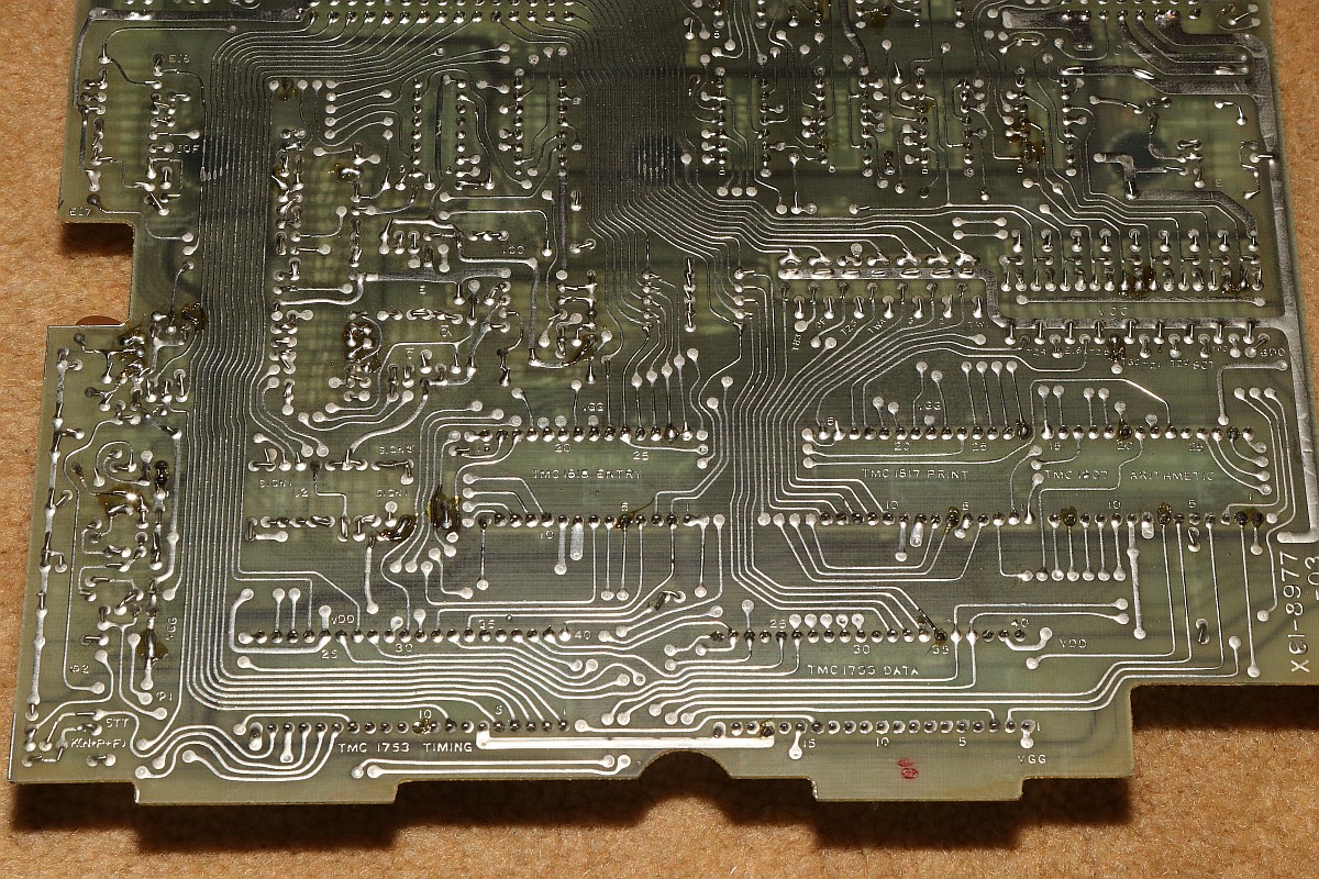 {Canon Canola MP131L - Rechnen ohne Display} Ein Neuzugang in meiner Rechnersammlung: eine Canola von 1972, Modell MP131L - ohne Display, dafür mit Drucker. Das Teil wirkt im Jahr 1972 etwas aus der Zeit gefallen, sind hier noch eine bunte Mischung aus Texas-DTL-Logikbausteinen mit einem niedrig integrierten Rechnerchipsatz (ebenfalls TI) verbaut, so gibt es bereits deutlich höher integrierte Tischrechner in kleinerer Bauform auf dem Markt. Das Gerät verzichtet auf eine Anzeige und bietet dafür einen Druckerklassiker (Shinshu Seiki Model-102) und eine LED-Zeile zur Anzeige der aktuellen Stelle bei der Eingabe. Es wirkt so, als habe man sich noch nicht ganz von den mechanischen Rechenmaschinen verabschieden wollen... Von einem Wackelkontakt im Tastaturstecker abgesehen, funktioniert die Rechenmaschine noch tadellos. Das Gehäuse ist großzügig - ich hätte eher mit voll-diskretem Aufbau gerechnet... (nettes Wortspiel...) Alles wirkt stabil und wertig - das soll sich bei Canon in den nächsten 20 Jahren grundlegend ändern... 18W und quasi EMV-gerecht... Der erste Blick unter die Tastatur lässt diskrete Logik erscheinen - das kann nicht alles sein... Der Drucker ist ein Klassiker: Shinshu Seiki Model-102 - oder später Epson EP-102 - dieses Modell wurde seinerzeit schon im Busicom 141 PF eingesetzt - dem Klassiker mit Intel 4004, den ich auch gerne in meiner Sammlung hätte... Es handelt sich um einen Trommeldrucker, dessen Drucktrommel mit erhabenen Lettern sich permanent dreht. Darauf liegen das Papier und das Farbband lose auf, kleine Hämmerchen schlagen auf das Farbband, wenn auf der Unterseite die richtige Zahl vorbeikommt. Das muss fix gehen, weil die Trommel dabei nicht anhält. Die Netzteilplatine ist überschaubar komplex - Spannungsregler sind anderweitig untergebracht. Ein dicker Glättungselko muss reichen... Die Seitenansicht des Druckers: Die Hauptplatine in 2400x1600 Pixeln Auflösung. Da ist noch mehr als DTL drauf. Ebenso von unten. Hier ist der oft eingesetzte Texas Instruments Rechenmaschinen Chipsatz - mittelmäßig integriert und je nach Maschinenanforderung unterschiedlich zusammengesetzt: Auf der Platinenunterseite ist die Funktion erklärt - gut, denn Datenblätter habe ich noch keine gefunden... Die Druckerelektronik arbeitet über einen DTL/TTL-Mix mit Schieberegistern - das spart Leitungen. Es ist schon ein aufwändiger Aufbau... ...mit extrem sicherem Erdungskonzept: Tastatur mit Reed-Schaltern für die Ewigkeit. Falsch! Der 8er Reed-Kontakt geht mittlerweile recht schlecht, da muss ich mal ersetzen. Die Steckverbinder sind sehr stabil und vergoldet - trotzdem kommt es hier nach 50 Jahren zu Wackelkontakten, vermutlich gehen die Gehäuse langsam auseinander und die Federkontakte drücken nicht mehr ausreichend auf die Gegenkontakte. Wenn die Tastatur nicht mehr richtig kontaktiert, merkt man das am Error-Lauflicht nach manchen Tastendrücken. Die Magnetschalter im Detail: Das Druckbild ist echt hübsch. Besonderes Schmankerl: das Tausender-Trennzeichen wird zwischen die Zahlen gedruckt und verschwendet keine zusätzliche Stelle! Die Power LED signalisiert Betriebsbereitschaft. Die weiteren LEDs zeigen, wieviele Stellen bereits eingegeben wurden. Hier: 6. Und die Memory LED zeigt an, ob im Speicher ein Wert steht. Das muss an Informationen reichen. Ein schöner und unverwüstlicher Rechner zwischen Mechanik und hochintegrierter Elektronik. Hier noch ein Überblick über die eingesetzten DTL Chips von TI - im Internet hat sich Brent Hilpert schon mal die Mühe gemacht, diese und viele andere technische Details der Rechenmaschinen zu reverse-engineeren: http://madrona.ca/e/eec/ics/TIDTL.html - Aber das Texas Instruments Datenbuch gibt nach einiger Suche bei den DTL-Serien auch die originalen Typennummern preis. {Canon Canola MP141 - The Next Generation} Andi M. hat mir freundlicher Weise Fotos seiner Canola MP141 geschickt - sieht so ähnlich aus wie die 131, ist aber intern schon deutlich weiter integriert! Der gesamte DTL/TTL-Kram ist schon zugunsten von Hitachi LSI-Chips verschwunden. Die Fortentwicklung der Technik in dieser Zeit war rasend schnell! Immerhin der Drucker ist noch der gleiche... |