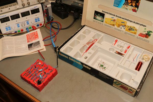 25.02.2025 {Kosmos Elektronik Junior} 1977, als man Elektronik noch mit "K" schrieb und ich zarte 10 Jahre alt war... Nach dem Kosmos-Physikpraktikum war dann knallharte Elektronik angesagt. 1977 war der Kasten ganz neu! Ab 10 Jahren - das hätte man mir nicht früher schenken dürfen! Der Serviervorschlag auf dem Katalogfoto sieht schon irre interessant aus. Und der Inhalt war es dann auch wirklich! Das umfangreiche und extrem nachbaufreundlich gestaltete Anleitungsheft hat mich erfolgreich durch alle Versuche geführt - bis hin zum funktionierenden Mittelwelleradio! Mangels guter Senderabdeckung wäre das heutzutage ziemlich sinnfrei. Ich habe nicht alles wirklich verstanden aber alles ausprobiert! Auch fast 50 Jahre später kann ich mich glasklar an eben die geniale Funktionserklärung eines Transistors erinnern, die mich im Kopf durch mein Studium und in meinen Beruf begleitet hat: das Schleusentor. Das konnten mir auch diverse Formeln und Vierpolparameter nicht austreiben - es geht halt nichts über anschauliche Erklärungen. Kosmos hat auf jeden Fall eine solide Basis für mein Berufsleben gelegt! {Kosmos Elektronik Junior Dokumentation} Hier ist der Scan der Bedienungsanleitung zum Experimentierkasten - zu Dokumentationszwecken. Das Urheberrecht liegt selbstverständlich bei der Franckh'schen Verlagshandlung Stuttgart. Ich habe Kosmos mehrfach, leider ohne Rückmeldung angeschrieben - Sollte von Seiten der Rechteinhaber eine Veröffentlichung unerwünscht sein, so werde ich das PDF umgehend entfernen - Nachricht per Mail reicht.