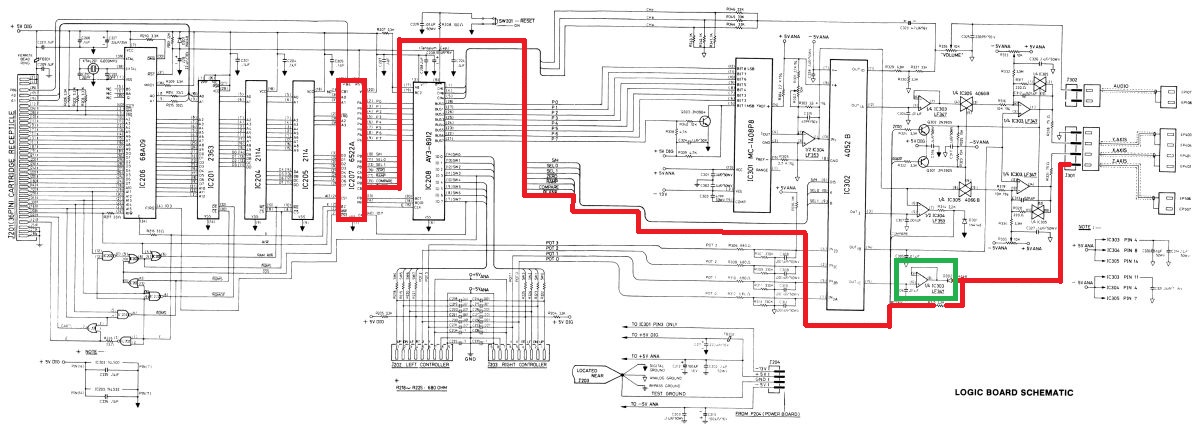 28.04.2026 {Vectrex #25 - Streifen, wohin man sieht...} Das ist ja mal ein interessantes Fehlerbild! Die Kiste läuft, Ton und Gameplay laufen wunderbar, selbst der Schalter zickt nicht rum. Aber das Bild lässt keine rechte Freude aufkommen. Endlich kann man mal erahnen, welche Arbeit die Vektorgrafik so zu verrichten hat, um einen flüssigen Bewegungseindruck zu erreichen. Und nach geschriebenem Vektor kehrt der Strahl stets in die Mitte des Bildschirms zurück. Und nein, die Bildhelligkeit ist optimal eingestellt! Die Texte sind speziell: hier mischen sich Rastergrafik und Vektorgrafik. Das Detail hier weist auch schon auf die Ursache des Fehlers hin: der Text ist ganz leicht lesbar - also funktioniert die Intensitätssteuerung (Kanal Z), nicht aber die Dunkeltastung (Blanking). Die multiplen Umrisse sind kein Fehler des Gerätes, sondern der Belichtungszeit geschuldet! Der Spannungsfolger LF347 aka MC34004 aka TL074/84 verarbeitet das Intensitätssignal und wird ggf. vom Blanking Signal überstimmt. Blanking kommt vom 6522. Der untere 14-Poler ist der OPAMP für vielerlei Signale. Während ich noch daran messe, fällt auch noch der Ton aus. Hier stirbt gerade der 6522 vollends... Die Leiche: Das war ja einfach! Alle relevanten Bauteile sind bei dieser Vectrex-Variante schon gesockelt... Einstecken, einschalten, geht... Zum Spaß hab ich mal verschiedene OPAMPs getestet, die laut TI "drop in replacement" sind. Die Ergebnisse sind interessant. TL074 funktioniert, aber der Verstärkungsfaktor (so denn ein Spannungsfolger sowas überhaupt haben kann...) ist unterschiedlich, die Schrift ist gestaucht und müsste mit den Potis im Gerät nachgeregelt werden... Dann nehme ich doch besser das Original und lasse alles so, wie es ursprünglich war. ![]() |