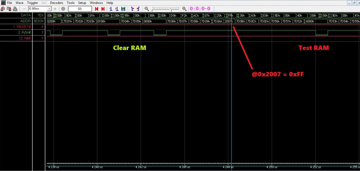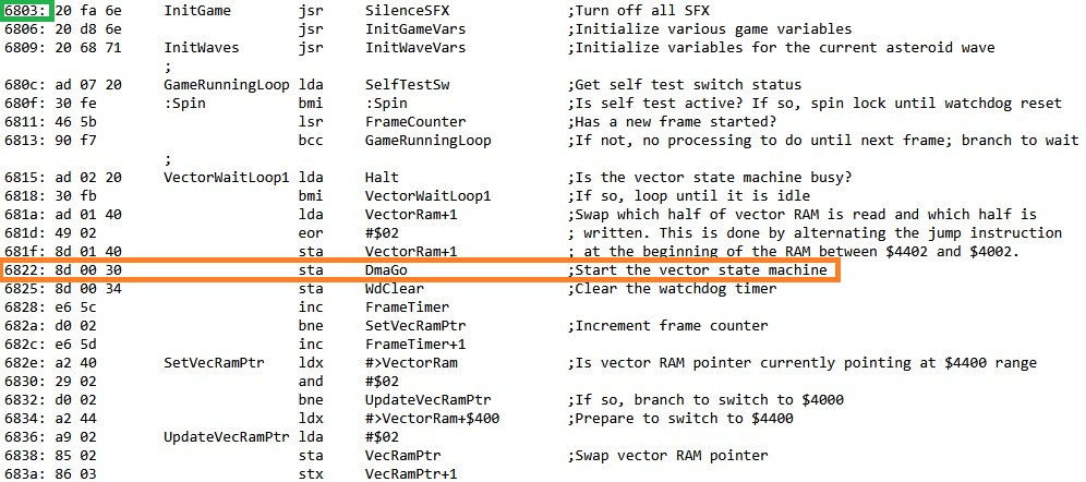 24.09.2025 {Asteroids im Doppelpack} Asteroids ist ein tolles Arcadespiel! Vektorgrafik, kaum Custom-Chips und sehr übersichtlich aufgebaut. Denkt man. Und wenn man dann zwei Platinen zur Reparatur bekommt, könnte man sich in der trügerischen Sicherheit wähnen, irgendwas zum Vergleichen zu haben. Die Wahrheit ist: ich kenne kaum ein Spiel, was sich so übel reparieren lässt, wie Asteroids. Missile Command vielleicht, oder Centipede. Ich erkenne ein Muster: Atari und alt - eine schlechte Mischung. Platine 1: Die RAMs hat schon mal wer getauscht... Die auch. Dann liegt es vermutlich nicht an den RAMs, wenn hier gar nichts geht. Platine 2: Hier gibt es keine Sockel, aber dafür ein Kreuz auf dem RAM. Die Bustreiber sind neu. Die hier auch, hat aber wohl nicht geholfen... Auch hier ist schon einiges gemacht worden - wer weiß, ob es danach besser oder schlechter geworden ist. Manchmal sind auch Reparaturen daran schuld, wenn nichts mehr geht. Diese CPU taktet immerhin, aber recht eintönig. Dazwischen legt sie sich mal schlafen, bis der WDT klingelt... Der 157er war auffällig aber leider nicht die Ursache. Ich habe endlich meinen Hilfstrafo gefunden. Die 2x18V benötigt man für die Vektorendstufen. Rustikal aber praktisch! Wir haben ein Bild - leider ohne sinnvollen Inhalt. Pieptöne gibt es auch nicht, eine Diagnose ist schwer zu geben. Manchmal ändert sich das Bild auch - ich werde mal alle verbliebenen 2114 tauschen, es scheint, als ob der Programmablauf gestört ist. Wenn beide Platinen nicht laufen, ist ein Vergleich schwierig. Ich bin gespannt! {Und es geht weiter!} Die Asteroids mit Funktion: immerhin funktioniert der NMI. Aber der ist auch Hardware-generiert. Ein geduldiger 4ms-Takt zum Bildaufbau. Die Asteroids ohne Funktion: Upps. Mein Fehler. Aber mit einem neuen 2114 läuft es genausowenig... Dafür meldet sich Kandidat 1 akustisch. Nachdem ich das Board mal komplett mit Lautsprecher verkabelt habe (immer eine gute Idee, die Asteroids sind akustisch mitteilungsfreudig, wenn sie mal anlaufen...) bekomme ich im Testmodus 4 höhere und einen tiefen Piepston. Das ist RAM N4. Das war übrigens auch der Baustein mit einem Kreuz drauf... Das RAM ist schnell getauscht. Die Asteroids sind mit dem richtigen Werkzeug sehr gut auszulöten. Das Programm startet ohne Fehler-Piep. Die RAMs scheinen in Ordnung zu sein. Wir haben ein statisches stabiles Bild. Im Testmodus kann man das Umlegen der DIP-Schalter jetzt optisch verfolgen. Außerhalb des Testmodus geht es immer noch nicht gut. Der Watchdog schlägt zu und das ist das Unangenehme bei Asteroids. Jeder Fehler im Vektor-Generator führt zum Programmabbruch und damit zum Watchdog. Gut, dass man den einfach stillegen kann. Jetzt bleibt erst mal Fehlersuche nach schlechten Pegeln. Nach einer Viertelstunde habe ich etwas gefunden. DVY5 sieht gar nicht gut aus! Ein 74191 ist mit 10 Ohm eingangsseitig viel zu niederohmig. Viele Kiloohm wären hier zu erwarten gewesen. Der Baustein ist getauscht, der Widerstand von DVY5 gegen Masse steigt auf 40 Ohm - "Not great, not terrible!". Da ist noch mehr defekt. An der Leitung hängt einiges drann, ich werde alle Teilnehmer ansehen müssen. Immerhin haben wir jetzt schon ein Bild, was fast nach Gameplay aussieht! Der Pegel hat es ja auch schon fast geschafft... Mich würde mal interessieren, woher dieser Schaden kommt, der diverse IC-Eingänge hat durchlegieren lassen... Kurzschluss? Überspannung? Jetzt muss ich erst mal 7497 bestellen, den habe ich nicht im Lager - braucht man so gut wie nie! Außer bei Asteroids... {Und es geht noch weiter!} Die Spezialbauteile sind da! 7497 ersetzt - die Pegel sehen gut aus! Plötzlich sieht auch das Vektorbild interessanter aus, auch wenn noch nichts richtig läuft... Zumindest wird hier mal was berechnet und dargestellt: Das Vector-Generator-ROM hat anormale Pegel auf den Datenleitungen. Da stimmt was nicht: Ich tausche den alten Bustreiber... Hier hat man daran gedacht, zwei verschiedene Typen einsetzen zu können. Ich wähle den modernen 74LS245. Hat leider nicht geholfen. Das ROM funktioniert. Die 2114 ersetze ich jetzt alle. Wow! Der Test-Screen läuft plötzlich einwandfrei. Aber hier werden auch keine Anforderungen an den Vector-Generator gestellt... Präventiv tausche ich (erfolglos) den letzten Uralt-Bustreiber. Auch gegen einen aktuellen Typen. Hilft nicht. Aus den 16-Bit Register-RAMs kommt teilweise nichts raus. Ich tausche zwei Bausteine. Während ich mich noch freue, stirbt einer der Bustreiber... Ich werde noch irre. War ja klar, Signetics SA. Aber nachdem der auch ersetzt ist, erwartet mich ein überraschendes Vector-Bild. Leider spinnt immer noch irgendwas im Vector-Generator-Teil - es gibt Artefakte und das Programm stürzt regelmäßig ab. Aber die Programmausführung läuft, der Vector-Generator zeichnet und der Testbildschirm meldet keine Fehler. Ich bin gespannt, ob ich die Ursache noch finde, bevor wieder irgendein Baustein stirbt... {Und ich krieg sie doch!} Warum funktioniert der Vektorgenerator nicht richtig? Stimmt vielleicht doch was mit den Registern nicht? Die ursprünglich verbauten 74LS170 sind Open Collector Typen, daher auch die Pull-Ups. 74LS670 sind 3-State Typen. Ich entferne vorsichtshalber mal die Pull-Ups. Sieht sauber aus, hat aber nichts genützt. Vielleicht hat das Vector-ROM einen Schuss? 2716 ist ein 1:1-Ersatz. Keine Änderung im Verhalten. Es sind keine Bausteine mehr übrig, die ein anormales Verhalten an den Ausgängen zeigen. Multiplexer haben allerdings manchmal die Eigenschaft, funktionsfähige Ausgänge, aber defekte interne Umschalter zu haben. Das sieht man mit dem Oszi nicht. Ein huckepack aufgesteckter Zweitbaustein zeigt dann allerdings Zwischenpegel, wenn die beiden Ausgänge mit widersprüchlichen Pegeln kämpfen. Das hat mich auf einen defekten 74LS157 gebracht. Hab dich, du Mistkerl! Platine 1 kann starten. Jetzt zu Platine 2: die CPU macht ein wenig und verwickelt sich dann in den Watchdog. Alle M