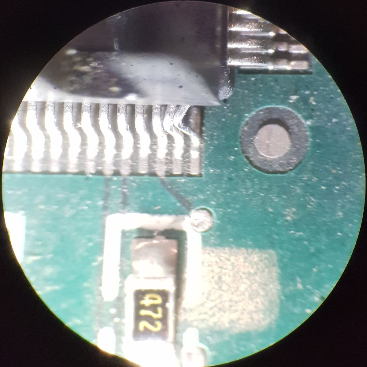 16.02.2026 {Killer Instinct} Midway? Nintendo? Rare? Keine Ahnung, wer sich jetzt für dieses Geschwür aus SMD-Bausteinen verantwortlich zeichnete, aber immerhin ist die Technik der Endzeit der Arcade-Ära ziemlich überschaubar. Sauber getrennte Blöcke aus Sound-DSP und Sound RAM/ROM, sowie Game-RAM und ein kleines Boot-EPROM sind klar zu identifizieren. Das eigentliche Spiel versteckt sich auf einer Festplatte und weil die nicht ewig hält, hier eben auf einer CF-Karte. Toll. Altera MAX 7000 PLDs, soweit das Auge reicht. Die moderne Form der Custom-Chips. Wenn die defekt sind oder ihre Programmierung (EEPROM) vergessen haben, dann war's das. Für den Ton: ADSP-2105-die günstige Variante der Analog Devices DSPs. Darunter befindet sich die zugehörige RAM-Speicherbank mit 16 Stück M628032 (32kx8) mit beeindruckenden 20ns Zugriffszeit. Für Spiel und Video: 16 Stück MT4C4001J dynamische RAMs 1Mx4 mit 60ns Zugriffszeit. Der Hauptprozessor befindet sich unter dem Kühlkörper: laut MAME eine MIPS 4600-based CPU. Die originale Festplatte wurde durch eine Compactflashkarte ersetzt. IDE ist halt IDE... Das Spiel startet nicht. Ein schmaler blauer Streifen baut sich immer wieder auf. Laut Netzfund deutet das auf defekte RAMs hin. Aber wie soll man die finden? Ich bin gespannt, ob ich an so einem modernen Teil etwas ausrichten kann. Erst mal die Pegel an den dynamischen RAMs testen, vielleicht hat ja auch einer der Bustreiber / Latches einen Schuss... Auf Druck oder Biegen der Platine verändert sich auf jeden Fall nichts, das macht eine kalte Lötstelle unwahrscheinlich. {Fehlersuche} Eine genaue Durchsicht mit dem Mikroskop erweckt Hoffnungen: Die ein paar Minuten später wieder enttäuscht werden - es ändert sich nichts. Entweder war es kein guter Kurzschluss oder er war nicht relevant. Die RAM-Bank am DSP heizt gut aber gleichmäßig. Die PLDs sind auch nicht auffällig. Die Main-CPU hat ihren Kühlkörper nötig. Aber auch hier gibt es keine offensichtlichen Auffälligkeiten. Die Bustreiber/Latches sind auch unauffällig, der linke untere Baustein ist ein anderer Typ, deswegen weniger warm... Die Programm-RAMs werden überhaupt nicht warm. Daten- und Adressbussignale sind alle unauffällig. Zur Kontrolle habe ich mal das Boot-ROM neu gebrannt (Any-IDE) - man weiß ja nie. Aber die EPROMs unterscheiden sich nicht und es funktioniert trotzdem nicht. Es bleibt mir wohl nichts anderes übrig, als passende RAM-Bausteine zu besorgen und diese Stück für Stück zu ersetzen... {RAM-Tausch extrem} Der endlose Aufbau eines blauen Balkens könnte ein RAM-Fehler sein - was liegt näher, als die RAMs zu tauschen? Auch wenn ich noch keinen Ersatz zur Hand habe, die alten RAMs können schon mal raus! Hierzu decke ich die übrigen Komponenten sorgfältig mit Alufolie ab, man will die alten Teile ja nicht unnötig stressen! Mit etwas Geduld und moderatem Luftstrom geht das ganz fix mit dem Heißluftfön. Die freien Pads werden mit viel Flussmittel und frischem Zinn für die Wiederaufnahme vorbereitet. Die Spenderriegel sind gekommen. Man bekommt zwar die RAMs nicht mehr - auf diversen PC-Speicherriegeln sind sie aber massenhaft verbaut. Ich habe gleich mal zwei geordert - man weiß ja nie... Der Heißluftfön hilft auch hier. Dank der geringen Platinenfläche geht das auch ganz fix und schonend. Auflöten möchte ich die RAMs nicht mit dem Fön, weil ich Sorge habe, dass der Luftstrom mir alles durcheinanderwirbelt. Deswegen habe ich mir mal fix meine Wekzeugausrüstung aufgestockt: eine Heizplatte für SMD. Mal am Spenderriegel testen: Flussmittel satt... Sauber verzinnen... Und einfach auflegen. Einige Sekunden später fließt das Zinn und der Baustein zieht sich in Position. Etwas Druck mit der Pinzettenspitze verbindet alle Lötstellen einwandfrei. Das war ja einfach. Dann probieren wir das mal mit der Killer-Instinct. Die Lötpads sind vorbereitet. Die Platine wird so gestützt, dass sie plan auf der Platte aufliegt. Es ist eine üble Arbeit, die Speicherchips so aufzulegen, dass sie nicht wegrutschen. Lötpaste wäre hier besser, die pappt gut. Aber leider habe ich keine zur Hand. 2 Minuten später ist alles aufgeschmolzen, der eine oder andere Baustein muss noch nachkorrigiert werden. Das Resultat ist gut aber nicht perfekt. Weil die Bausteine so eng beieinandersitzen, sieht man nichts. Das nachträgliche Durchklingeln der Verbindungen entdeckt drei offene Lötstellen, die ich mit der feinen Lötspitze nachbessern muss. Kontrolle ist hier also unabdingbar. Und letztendlich kam es auch noch zu einer kleinen Delamination der Leiterplatte - vielleicht sind die 260°C doch schon zu heiß gewählt. Egal: nachdem alles verbunden ist, läuft die Platine immer noch nicht. Jetzt messe ich jedes einzelne Signal durch. Alle Daten- und Adressleitunge enden an den entprechenden Treibern. RAS tackert so vor sich hin, aber CAS fehlt bei einer RAM-Gruppe. Das kann natürlich nicht funktionieren! Am Treibereingang des 74FCT162244 liegt es noch an... Also sind vermutlich die RAMs in Ordnung gewesen... Ohne CAS gibt es keine Adressierung. Die 16-Bit Driver sind übel. Selten und klein... Und die Impulsbreiten liegen unter 50ns... Ich weiß schon, warum mir ganz alte Technik lieber ist - man hat einfach mehr Platz! Ein 74FCT162244 in SSOP ist bereits bestellt... so etwas habe ich natürlich nicht auf Lager! {Treiber-Tausch} Mouser hat geliefert, genauer gesagt: ein freundlicher Forist aus dem Microcontrollerforum, der die Sammelbestellung organisiert hat! In der großen Verpackung liegt ein kleiner Gurtabschnitt mit zwei noch kleineren Bustreibern. Jetzt will ich es wissen! Die Platine von unten auf 180°C vorgeheizt und von oben mit dem Heißlftfön gefönt - der Baustein ist in wenigen Sekunden herunter. Durch die gezielte Wärme ist die Platine nur recht wenig gestresst, ebenso die umliegenden Bauteile. Die Pads werden sauber geputzt, duch die winzigen Abmessungen kann man hier nicht mit Amateur-Reflow arbeite
