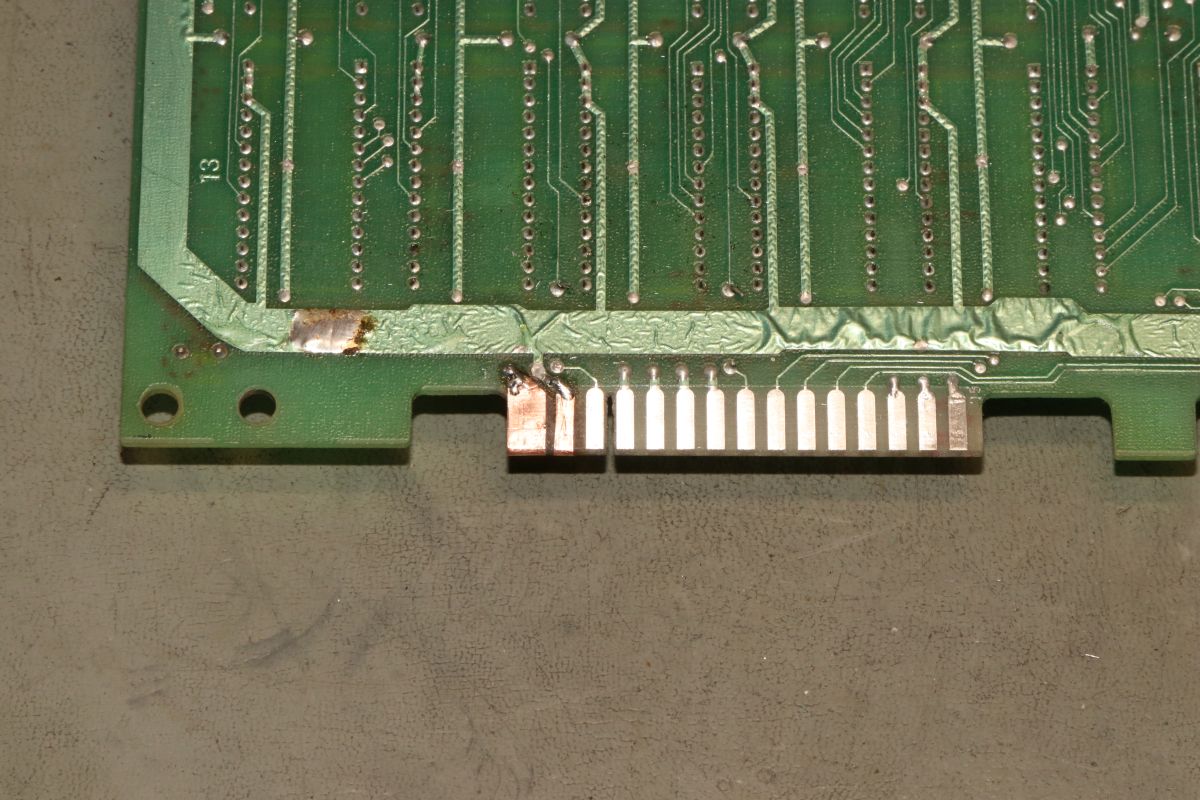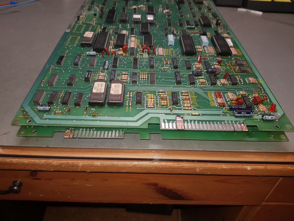01.02.2026 {Pole Position} Hier hab ich mal wieder eine... Auslaufende Akkus, tonnenweise Customs, Kuchenblech-große Platinen und CPUs, die sonst niemand nimmt - was will man mehr. Zumindest hat schon jemand den Akku entfernt und grob geputzt! Allerdings ist überall irgendwas Klebriges drauf... Der typische PP-Brandschaden - Das Spiel hat einfach zu viel Power für die lümmeligen Steckverbinder! Die separaten Stromversorgungskabel sind hier mandatorisch! Ein sehr altes Spiel mit sehr guter Grafik (für die Zeit). Zwischen den Platinen befindet sich ein großzügig dimensioniertes Schaumstoffpad als Abstandshalter. Den Schaumstoff kann man mittlerweile wegpusten - hier muss was Besseres her. Als erstes muss ich mal die großflächigen Verätzungen besser reinigen. IC 6A sieht nicht gut aus, funktioniert aber noch. Erstmal nur sauberkratzen... Besser geht es nicht, zumindest sind jetzt keine ätzenden Rückstände unter dem Lötstoplack mehr vorhanden. Ein paar Kabel und KFZ-Steckverbinder reichen für einen rudimentären Anschluss. Toll. Immerhin haben wir ein Videobild. RESET# liegt auf 0,5V... das sollte so nicht sein. Um die CPUs zum Laufen zu zwingen, kann man mal hart +5V am linken Stecker einspeisen. Na, geht doch! Die CPUs laufen. Bis zum Speichertest. RAM 1 ist ein 2114 auf der Videoplatine: IC 7F. Tauschen und sockeln - mit guter Lötausrüstung geht das richtig fix! Wieder ein stehendes Bild ohne Grafik - aber das liegt am DIP-Schalter, der auf Freispiel gestellt ist! Da springt das Spiel direkt in die Start-Aufforderung. Drei DIP-Schalter später: Jetzt crasht nur noch der Wagen... Das ist der Bereich, der für den RESET zuständig ist. Denkbar simpel, ein Elektrolytkondensator lädt sich über einen Widerstand auf 5V auf und wird ggf. vom Watchdog Timer überstimmt. Wenn da keine 5V an der Klemme sind, dann könnte es am Elko liegen. Da werde ich wohl mal den Übeltäter ersetzen. {Dauerreset - warum?} Der Elko war es nicht - ebensowenig der Hex-Schmitt-Trigger-Inverter 4584 aka 40106... Aber das merkt man erst nach dem Tausch. Wer ist noch in der Open-Collector-Sammlung von Reset-Signalen beteiligt? Richtig! Der Watchdog-Timer. Und der sitzt direkt im Akku-Schmodder. Der 74LS161 war quasi richtig angefressen und hat den Dienst quittiert. Dauer-Reset! Jetzt hab ich wenigstens einen Grund, diese Ecke mal richtig zu reinigen. Und mit einem neuen Baustein läuft auch der Watchdog wieder ganz sauber und der Reset macht, was er soll: nach wenigen Sekunden die CPUs freigeben! Hier noch mal die Details auf dem Schaltplan: nicht immer ist alles, wie es zu sein scheint! Jetzt noch passende Kabel adaptieren und schon ist der Patient vollständig genesen! {Steckerreparatur} Der Vollständigkeit halber: Der Besitzer hat sich inständig eine Reparatur des Platinensteckers gewünscht. EMV-Kupferklebeband und Sekundenkleber sind hier sie wichtigen Utensilien. Aber Achtung: mit Sekundenkleber geklebte Leiterbahnen haben nicht annähern die Haftkraft, wir originale Kupferbahnen. Hier steckt man besser nur noch einmal mit sehr viel Gefühl! |