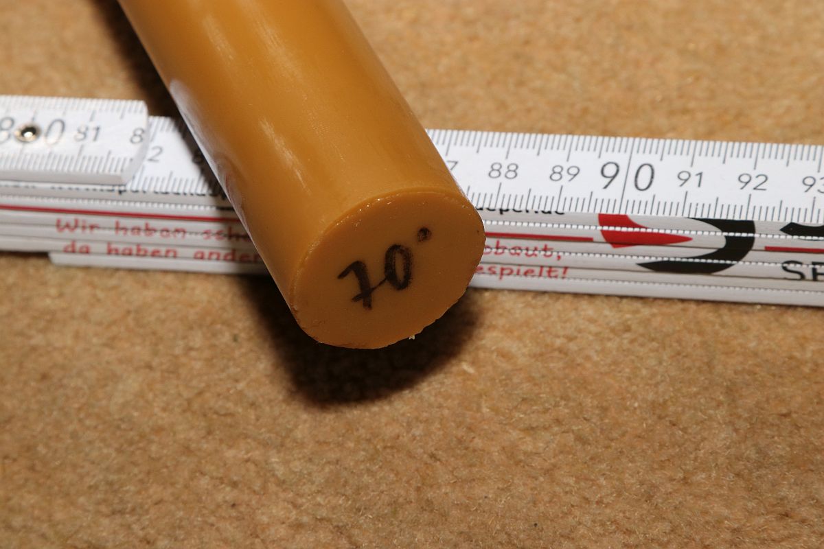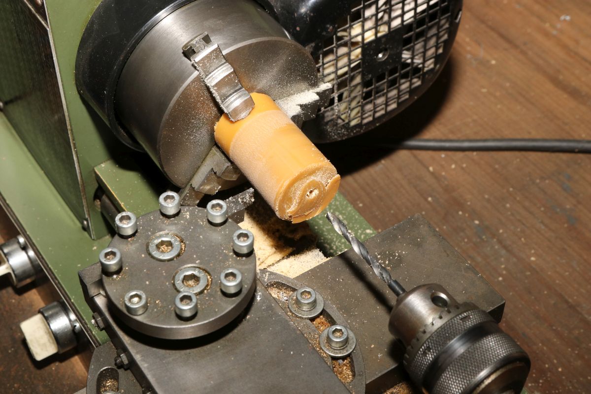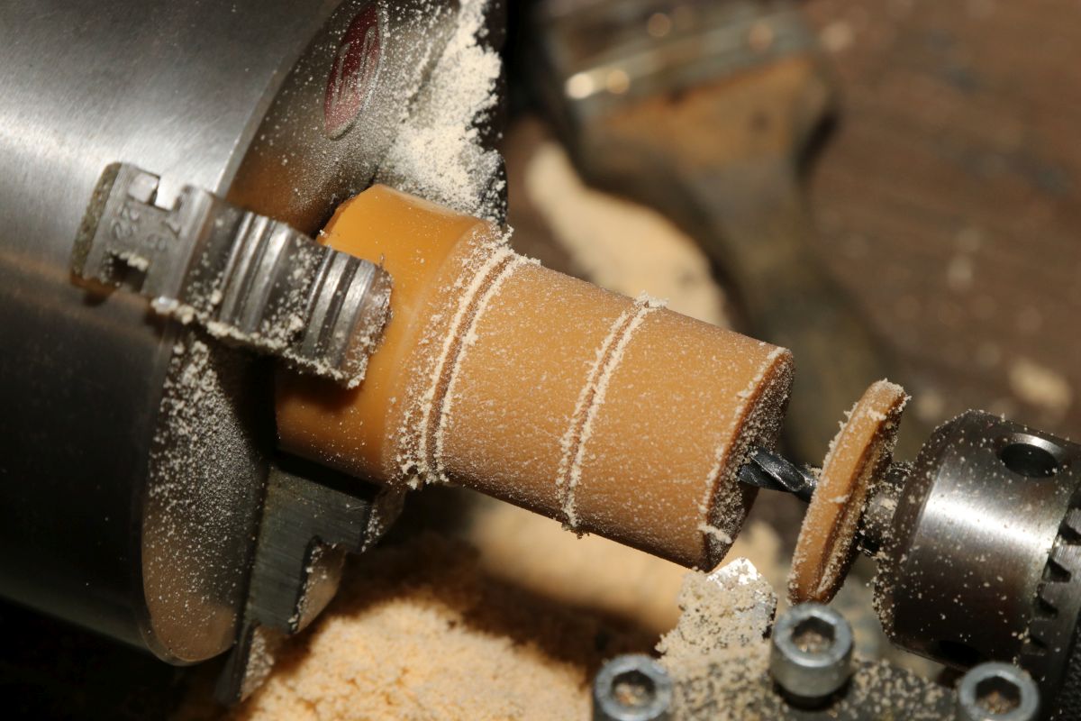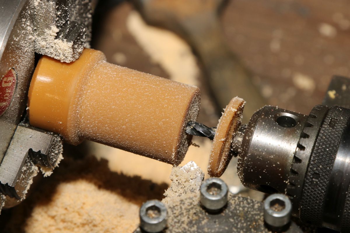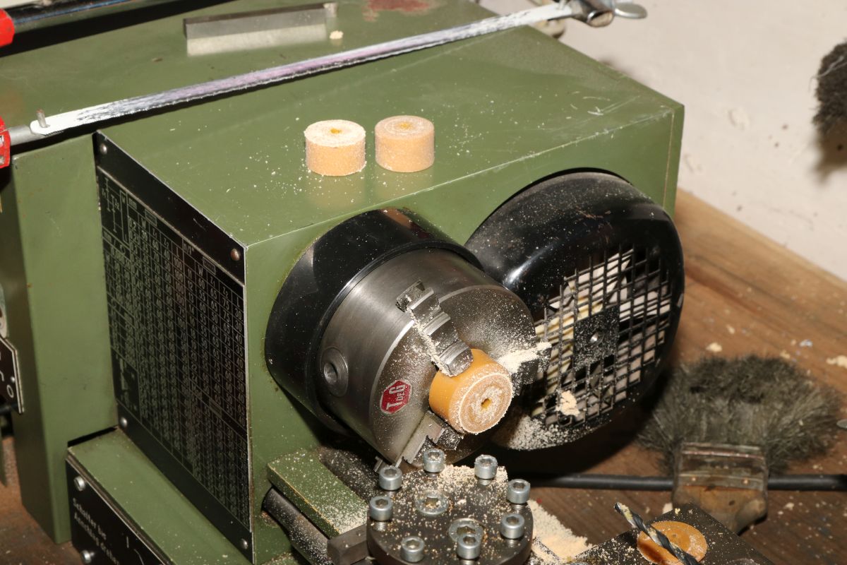 {Diehl Andruckrolle selbst gefertigt} Ein Problem, welches alle Diehl Maschinen der Serien Combitronic, Algotronic und alle Vertreter mit Stahl-Lochstreifen berifft: die Andruckrollen haben sich im wahrsten Sinne des Wortes "verkrümelt". Die Zielgröße hat folgende Maße: Durchmesser 26mm, Bohrung 4,5mm, Dicke 13mm. Dazu versuche ich es erst mal mit einem ca. 50mm langen Teilstück. Das lässt sich mit einem scharfen Messer ziemlich mühsam von der Stange schneiden... Die Shore Härte 70° entspricht so ziemlich der Elastizität von Reifengummi, also perfekt für den Einsatzfall. Nicht perfekt hingegen für das Einspannen in einem Backenfutter. Hier ist viel Fingerspitzengefühl und eine vorsichtige Ausrichtung über die mitlaufende Körnerspitze gefragt. Dann muss als erstes die zentrische Bohrung einmal durch das ganze Material gesetzt werden. Der Bohrer (4,3mm) wird mit etwas Öl geschmiert und verbleibt im Werkstück. Er sorgt für die Stabilität. Dann dreht man das Werkstück auf das gewünschte Maß ab - wobei von Abdrehen nicht die Rede sein kann, eher von "Abrubbeln"... Das ist extrem mühsam und benötigt einen gleichmäßigen Vorschub, sonst gibt es Riefen... Nach 20 Minuten und x-mal Hin und Her sieht das Werkstück schon ganz gut aus! Die Oberfläche kann beim fertigen Werkstück mit grobem Schleifleinen geglättet werden, aber die Rauhigkeit ist perfekt für unseren Antrieb! Die einzelnen Scheiben trennt man mit einem dünnen Eisensägenblatt am rotierenden Werkstück. Scheibe für Scheibe... Die Ergebnisse können sich sehen lassen! Das Material ist so elastisch, dass es sich trotz der 4,5mm Bohrung problemlos auf die 6mm Welle aufziehen lässt und hat dabei genügend Reibung, um nicht durchzurutschen. Das Ergebnis ist beeindruckend, der Bootprozess lief noch nie so ruhig und vibrationsfrei wie mit dieser PU-Rolle! Jetzt fertige ich mal ein paar Rollen auf Vorrat... da warten noch viele Maschinen drauf! ;-) |