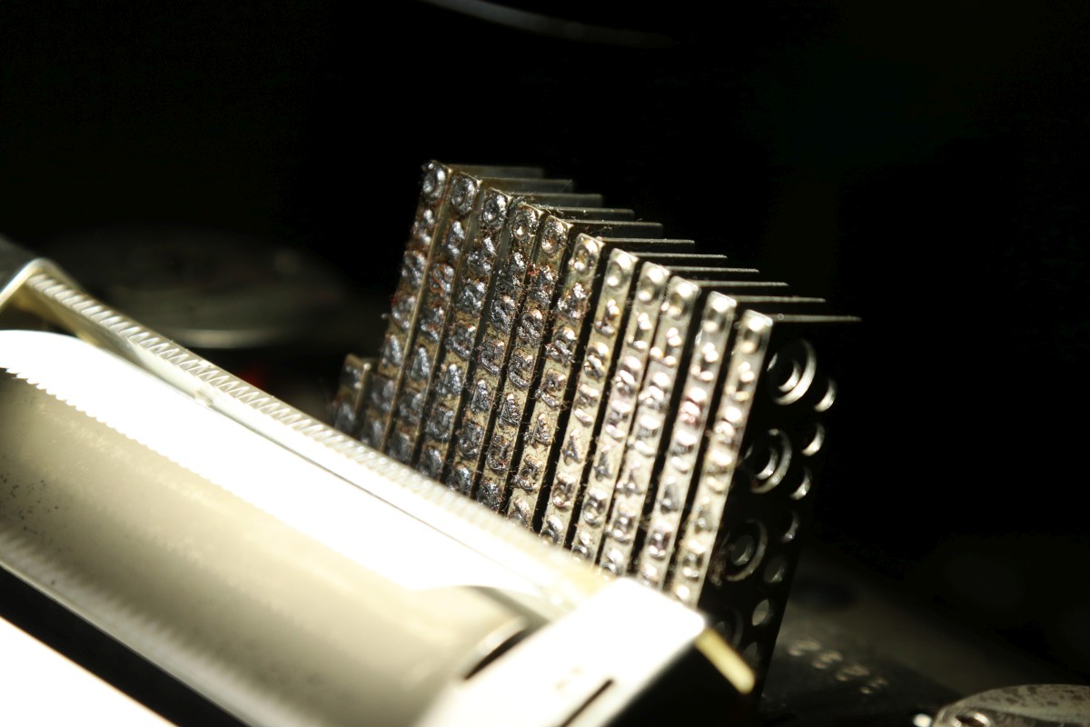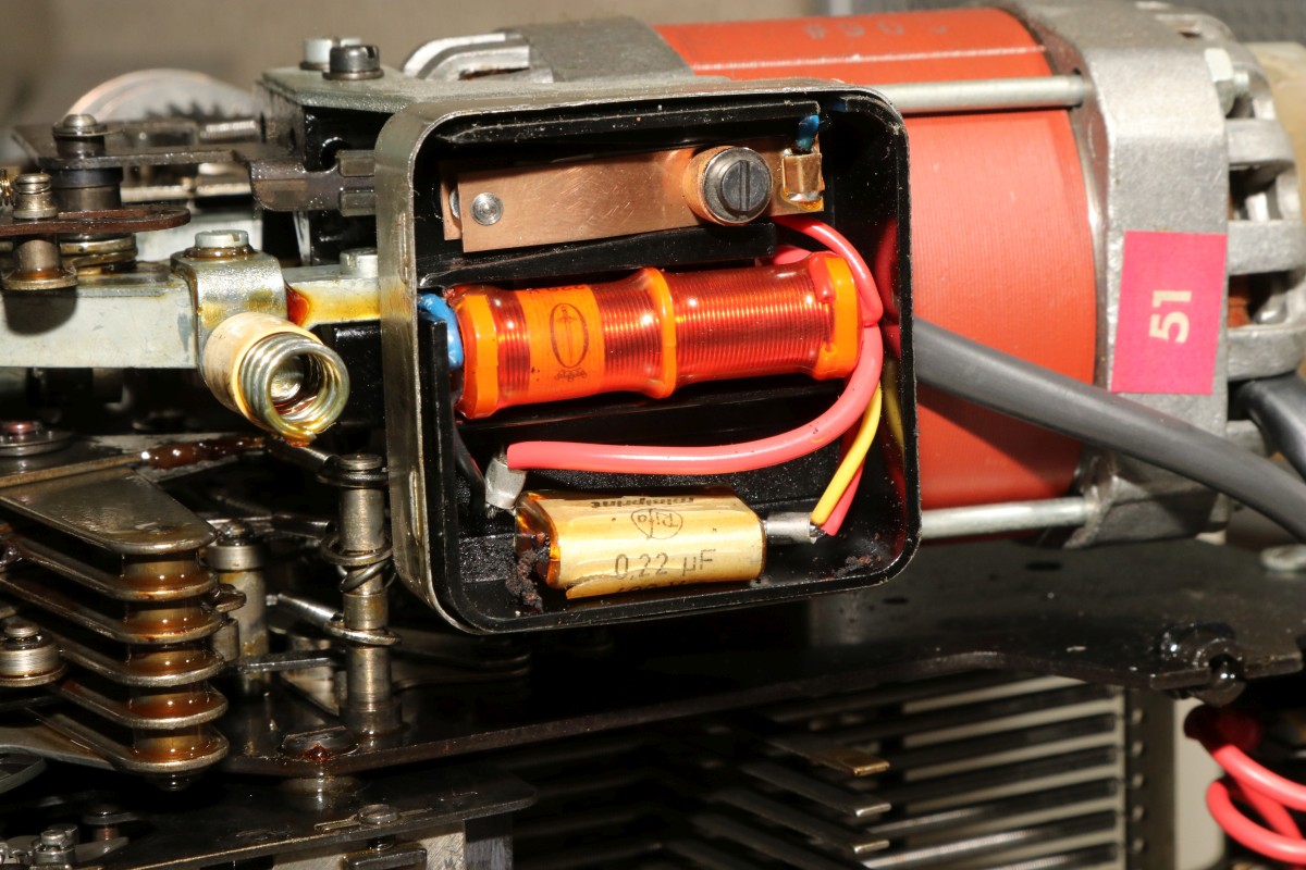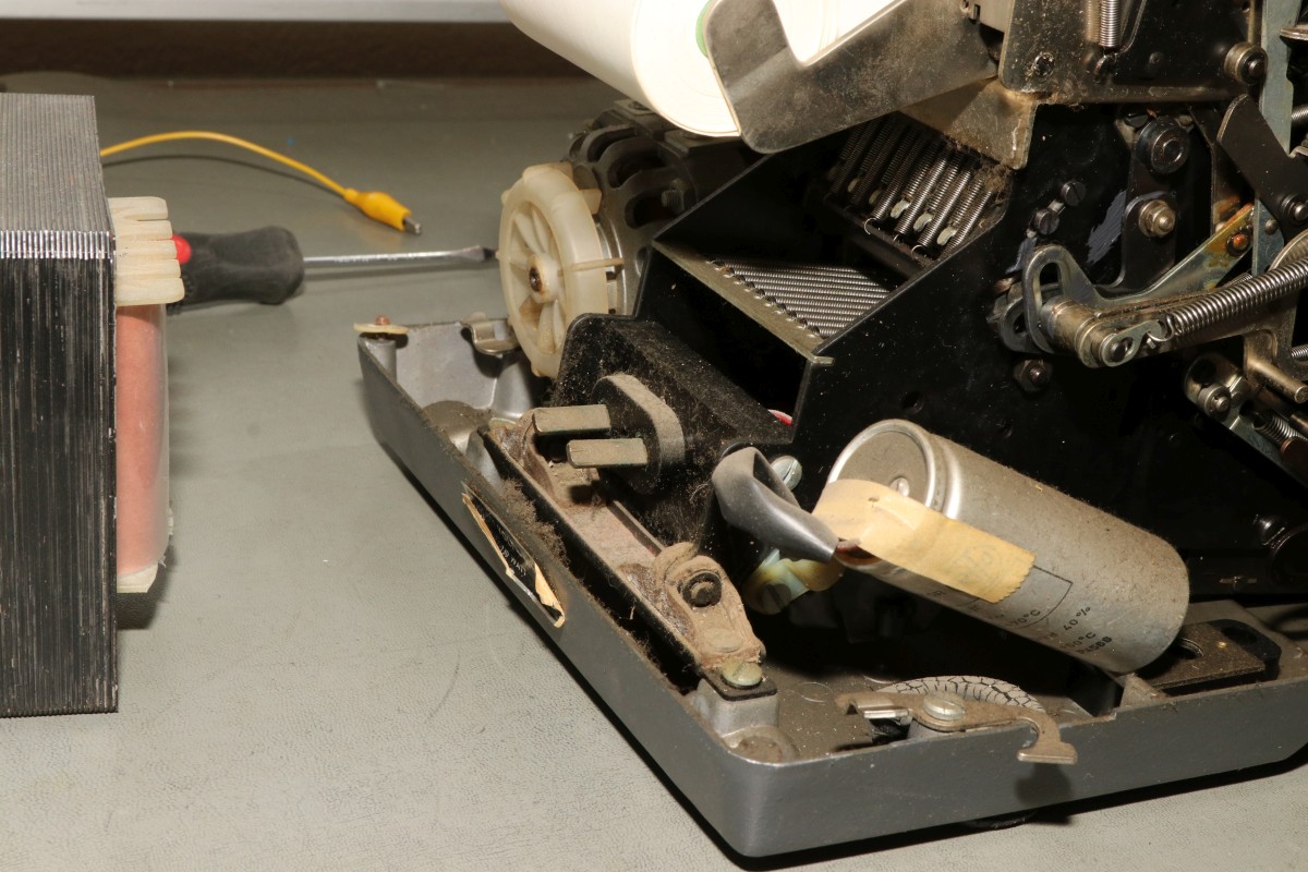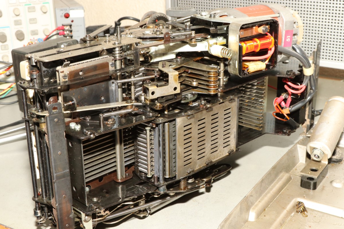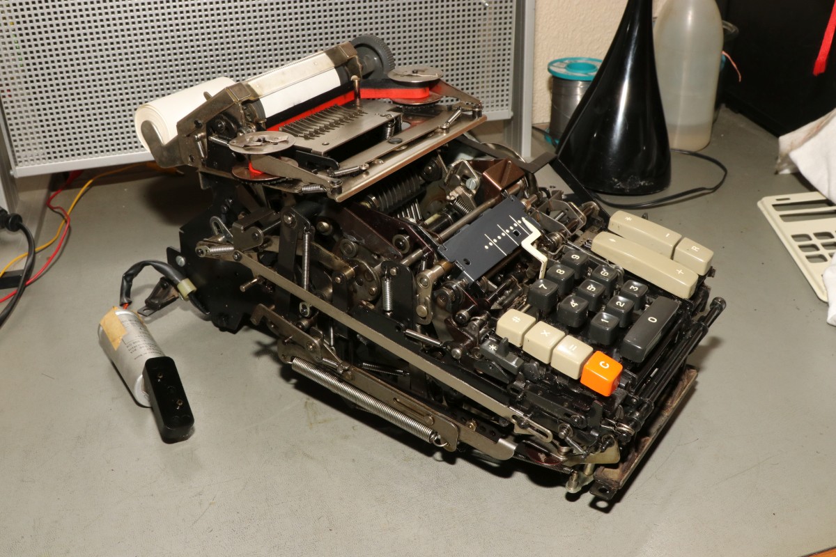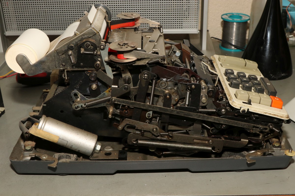 {ODHNER MX11C-9 Drei Spezies Rechenmaschine} Zuweilen werden mir Geräte zugeschickt, die sich als höchst interessant herausstellen! An dieser Stelle einen herzlichen Dank an Florian H. für die freundliche Spende! Hier handelt es sich um eine elektrisch angetriebene Drei Spezies Rechenmaschine der schwedischen Firma Odhner, die zwischen 1966 und 1968 verkauft wurde. Der Verkaufspreis lag damals bei über 1100DM - ziemlich viel Geld. Dafür kann diese Maschine Addition, Subtraktion und Multiplikation - daher auch die Bezeichnung "Drei Spezies". Das Besondere an dieser Maschine: sie ist zum Zeitpunkt meiner Geburt verkauft worden. Ein netter Zufall. Die Maschine kam bei mir funktionsuntüchtig und verdreckt an... Das Typenschild liegt gut versteckt auf der vorderen Unterkante. An den verwesten Gummifüßen kleben Schätze - selten bekomme ich Exponate und Geld gleichzeitig geschenkt! Ein passendes Netzkabel fehlt leider - zwei schräge Kontakte grinsen mich höhnisch an. Ich zücke Krokoklemmen und meinen Trenntrafo. Ihr haltet mich nicht auf! Es brummt und der Motor dreht nicht... Die Maschine ist völlig verharzt... Die Tastatur und die Stellenanzeige - diese Maschine hat kein Display! Ergebnisse und Eingaben werden auf dem Drucker gedruckt! Jaja... WD40 ist kein Schmiermittel. Aber es löst alle Verharzungen und macht die Wellen und Achsen wieder freigängig. Ich bin großzügig damit. Nach einer Weile und mit Unterstützung am Antriebsmotor wird die Maschine langsam wieder geschmeidig! Diese Stangen drucken - sie werden einfach soweit herausgefahren, bis die richtige Zahl vor dem Papier steht. Farbband und ein beherztes Kippen tut sein Übriges. Übrigens ist diese Druckmechanik integraler Bestandteil des mechanischen Speicher- und Rechenwerks. Beim Multiplizieren kann man diesem schön bei der Arbeit zusehen... So müssen sich die Ägyptologen bei der Öffnung der Grabkammer der Pyramiden gefühlt haben... Nach gehöriger Schmierung läuft die Maschine... bis es anfängt zu stinken. Ganz gewaltig - ich ahne es... Der Motor läuft nur, wenn man eine Taste drückt, die Maschine besitzt keinen Hauptschalter! Der Motor wird über diesen Schalter mit Entstörglied aktiviert: Der kleine weiße Pin ist der Stößel für den Federkontakt: Hier ist der Stinker, war ja klar: RIFA-Pest. Zum Testen geht es auch ohne den Kondensator. Wenn an dieser Mechanik irgendwas kaputt geht - ich will und kann es nicht richten! Aber das Teil ist für die Ewigkeit gebaut! Für die Gummifüße muss ich mir was einfallen lassen - die sind definitiv nicht für die Ewigkeit gebaut gewesen... Jetzt kommt die Fleßarbeit: Reinigen. Zuerst die versiffte Bodenplatte... Glänzt. Auch das Gehäuse sieht nach einer Spüli-Kur wieder fast aus wie neu! Das Tastaturblech mache ich dann auch gleich noch... Aber erst mal die Mechanik - vorsichtig mit Zahnbürste, Ohrstäbchen und einem geölten Lappen... Nicht zu fest! die vielen Federchen sind nur leicht eingehängt! Die gereinigte Tastaturabdeckung kommt wieder an ihren Platz... Und schon steht sie wieder wie frisch da: von Vorne: Von der Seite: Und von Hinten... Nach 50 Jahren rechnet diese Maschine immer noch leicht und zuverlässig - das nenne ich mal nachhaltige Technik.