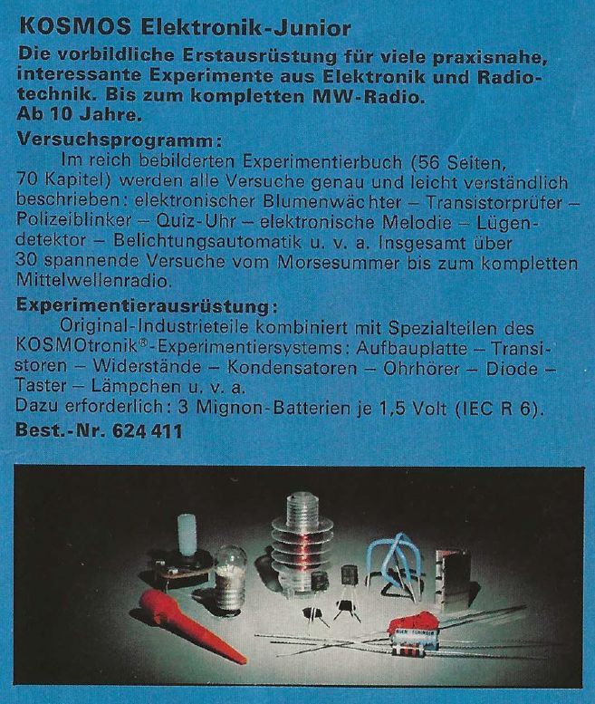 25.02.2025 {Kosmos Elektronik Junior} 1977, als man Elektronik noch mit "K" schrieb und ich zarte 10 Jahre alt war... Nach dem Kosmos-Physikpraktikum war dann knallharte Elektronik angesagt. 1977 war der Kasten ganz neu! Ab 10 Jahren - das hätte man mir nicht früher schenken dürfen! Der Serviervorschlag auf dem Katalogfoto sieht schon irre interessant aus. Und der Inhalt war es dann auch wirklich! Das umfangreiche und extrem nachbaufreundlich gestaltete Anleitungsheft hat mich erfolgreich durch alle Versuche geführt - bis hin zum funktionierenden Mittelwelleradio! Mangels guter Senderabdeckung wäre das heutzutage ziemlich sinnfrei. Ich habe nicht alles wirklich verstanden aber alles ausprobiert! Auch fast 50 Jahre später kann ich mich glasklar an eben die geniale Funktionserklärung eines Transistors erinnern, die mich im Kopf durch mein Studium und in meinen Beruf begleitet hat: das Schleusentor. Das konnten mir auch diverse Formeln und Vierpolparameter nicht austreiben - es geht halt nichts über anschauliche Erklärungen. Kosmos hat auf jeden Fall eine solide Basis für mein Berufsleben gelegt! {Kosmos Elektronik Junior Dokumentation} Hier ist der Scan der Bedienungsanleitung zum Experimentierkasten - zu Dokumentationszwecken. Das Urheberrecht liegt selbstverständlich bei der Franckh'schen Verlagshandlung Stuttgart. Ich habe Kosmos mehrfach, leider ohne Rückmeldung angeschrieben - Sollte von Seiten der Rechteinhaber eine Veröffentlichung unerwünscht sein, so werde ich das PDF umgehend entfernen - Nachricht per Mail reicht.