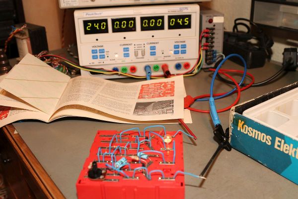 {Kosmos Elektronik Junior - jetzt wird es ernst!} Es kam, wie es kommen musste: ich habe mir den Originalkasten gekauft... Nicht vollständig und in etwas armseligem Zustand, aber für die Experimente und deren Dokumentation langt es. Es ist schon ein komisches Gefühl, nach über 45 Jahren diese Komponenten wieder in den Händen zu halten. Der astabile Multivibrator - mein erstes Elektronikexperiment, bei dem eine Lampe ohne mechanische Einwirkung blinken konnte. Das hat mich damals extrem fasziniert! Die dafür notwendigen Teile sind noch alle original! Da wird einem warm um's Herz: Ich erinnere mich auch daran, dass ich zwar alles sauber aufgebaut bekommen habe, die Theorie hinter den Schaltungen habe ich aber nur sehr bruchstückhaft verstanden... Trotzdem: man lernte Transistoren, Widerstände, Potis, Dioden und Kondensatoren kennen. Ein nicht zu unterschätzender Wissensgewinn! Gibt es eigentlich noch Sender auf Mittelwelle? Ein Mittelwellenradio ist nämlich bei den Aufbauten auch dabei! {Kosmos Elektronik Junior komplett} Es hat mir keine Ruhe gelassen: ich will jetzt den kompletten Kasten in gutem Zustand haben! Kleinanzeigen hat mir diesen Wunsch erfüllt. Mit DEN Aufklebern MUSS der Kasten original sein... Zur Abwechslung ist mal alles drin... Teilweise gut gebraucht... Der Batteriehalter - lange gesucht - sieht etwas traurig aus. Ein Auslaufmodell... Auch das Zubehör ist teilweise heftig korrodiert: Dafür ist der Bauteilehalter noch vorhanden. Diese Teile müssen intensiv behandlt werden: Die Zinkstreifen sind völlig weiß... Das ist bestimmt nicht gesund. Grundreinigung mit Essigsäure. Nach dem Waschen und der Behandlung mit einer Drahtbürste sehen die Streifen wie neu aus! Auch der Batteriehalter strahlt in alter Schönheit. Nun ist der ganze Kasten wieder ansehnlich und vollständig bestückt! Die Batterien sind natürlich nicht original - besser so! Alle Bauteile sind vorhanden: Die Drahtbrücken warten auf den Einsatz. Den Papierkram werde ich noch mal einscannen - da ist sogar ein Lieferschein für Ersatz-Batteriefedern dabei. Wer den Kasten in Aktion sehen will, der konnte das auf dem Zerobrain Live Event machen, aber davon gibt es bestimmt auch demnächst einen Film. |